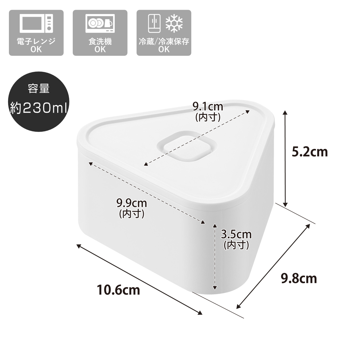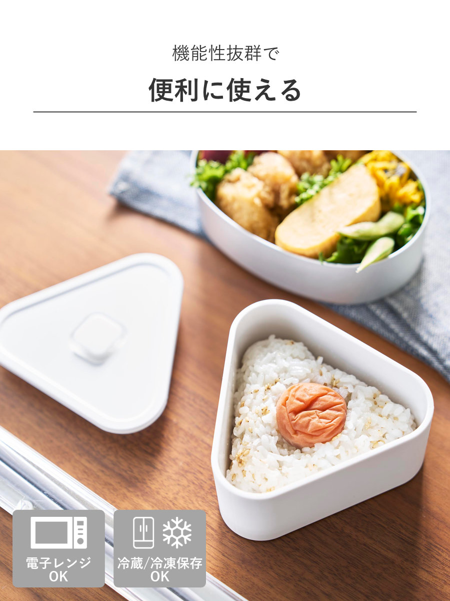 コンビニのおにぎりもきれいな形のまま収納できます。ワンプッシュでしっかり密閉でき、持ち運びも安心です。