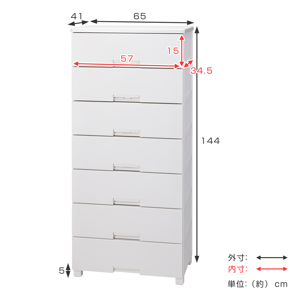 | サイズ | 約 幅65×奥行41×高さ144(cm) 引出内寸:約 幅57×奥行34.5×高さ15(cm) |