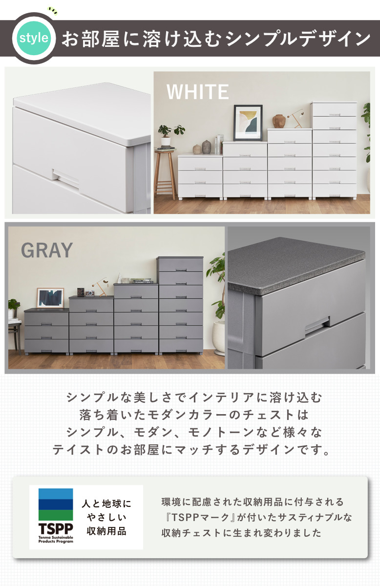| 材質 | 引出し・外枠・ロック・脚:再生ポリプロピレン(再生材比率10%以上) ローラー:ポリプロピレン すべり止め:ポリエチレン 前パネル:スチロール樹脂 天板:プリント化粧木質繊維板 |