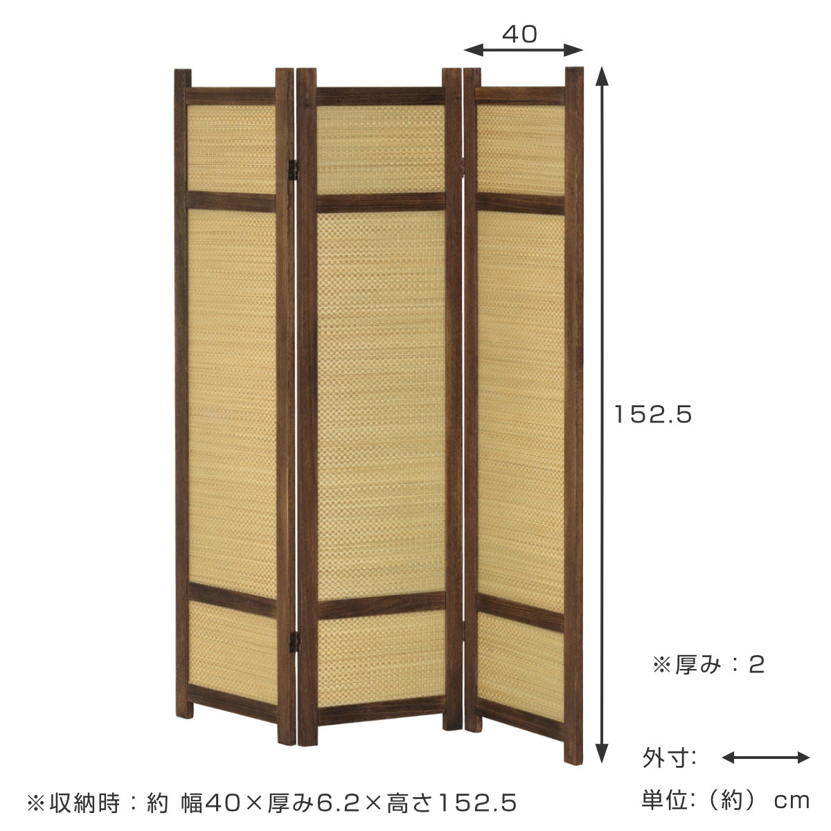 | サイズ | 1枚:約 幅40×厚み2×高さ152.5(cm)×3連 収納時:約 幅40×厚み6.2×高さ152.5(cm) |