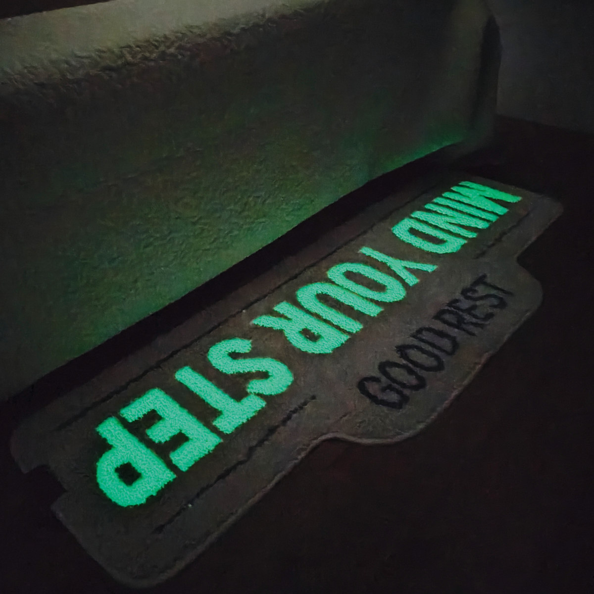 ●「MIND YOUR STEP」の蓄光ロゴが施されており、キッチンやベッドルームなど、室内で使いやすいです。