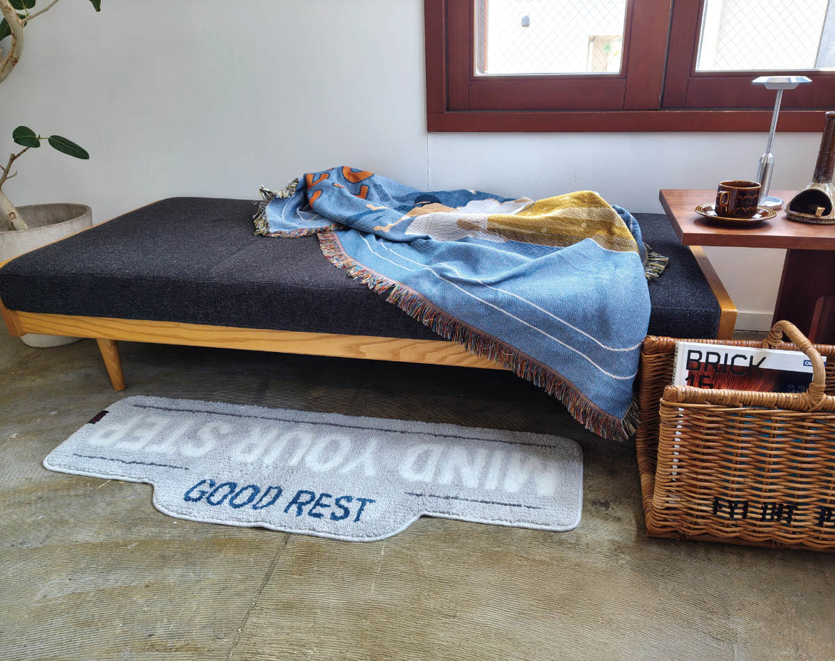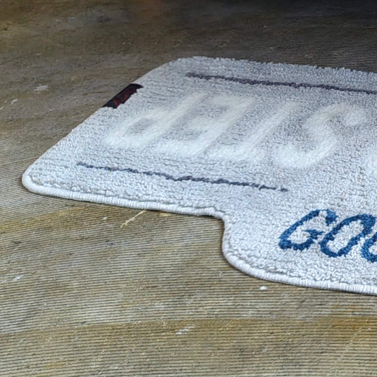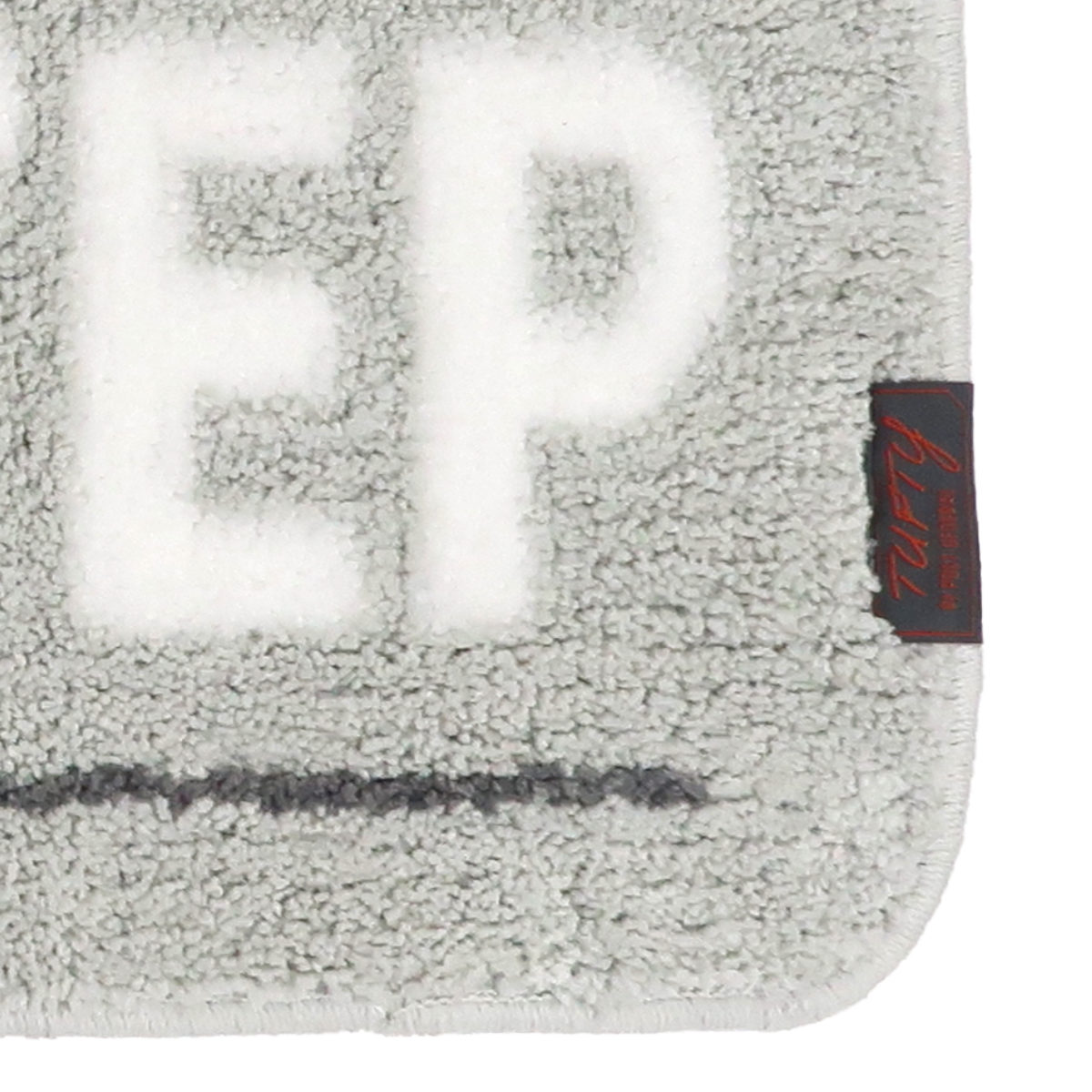 ●タフト製法で丁寧に仕上げたふんわりとした質感に、英字ロゴを大胆にあしらった印象的なデザインです。