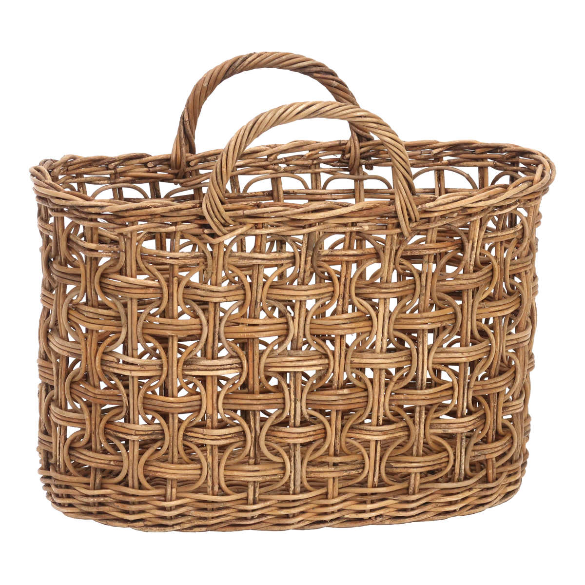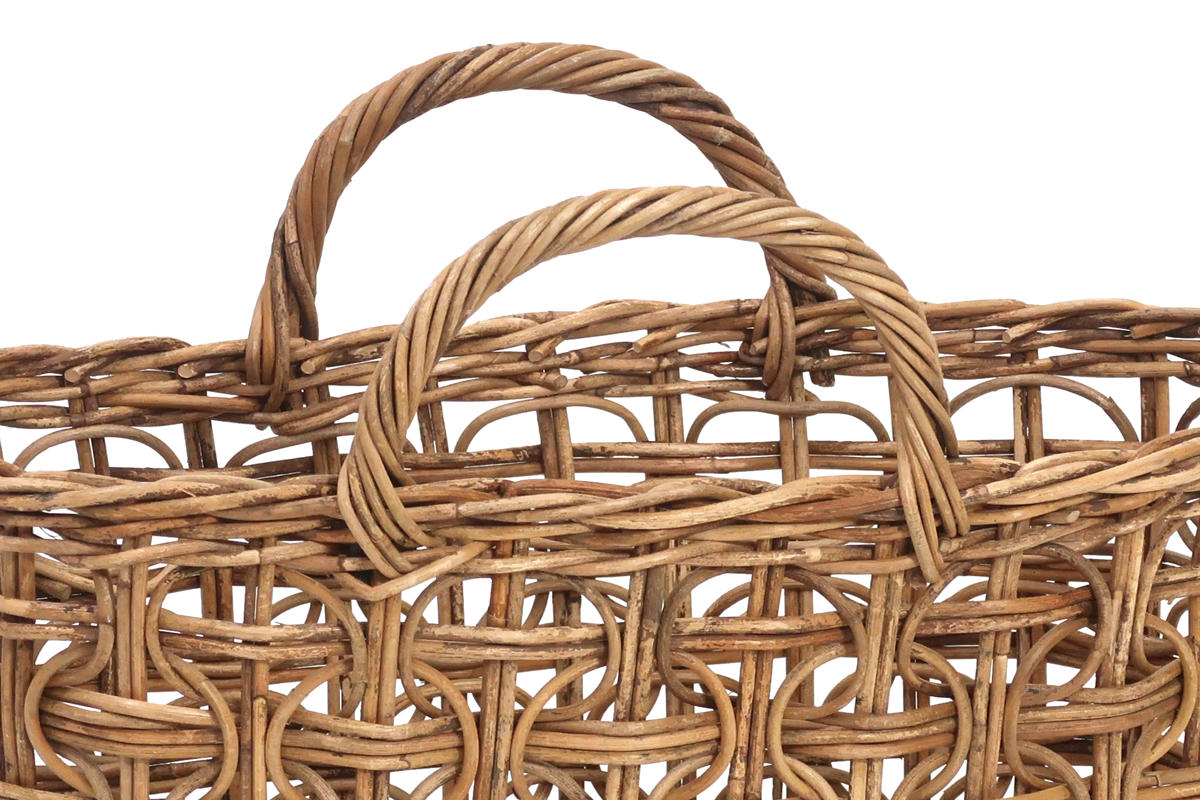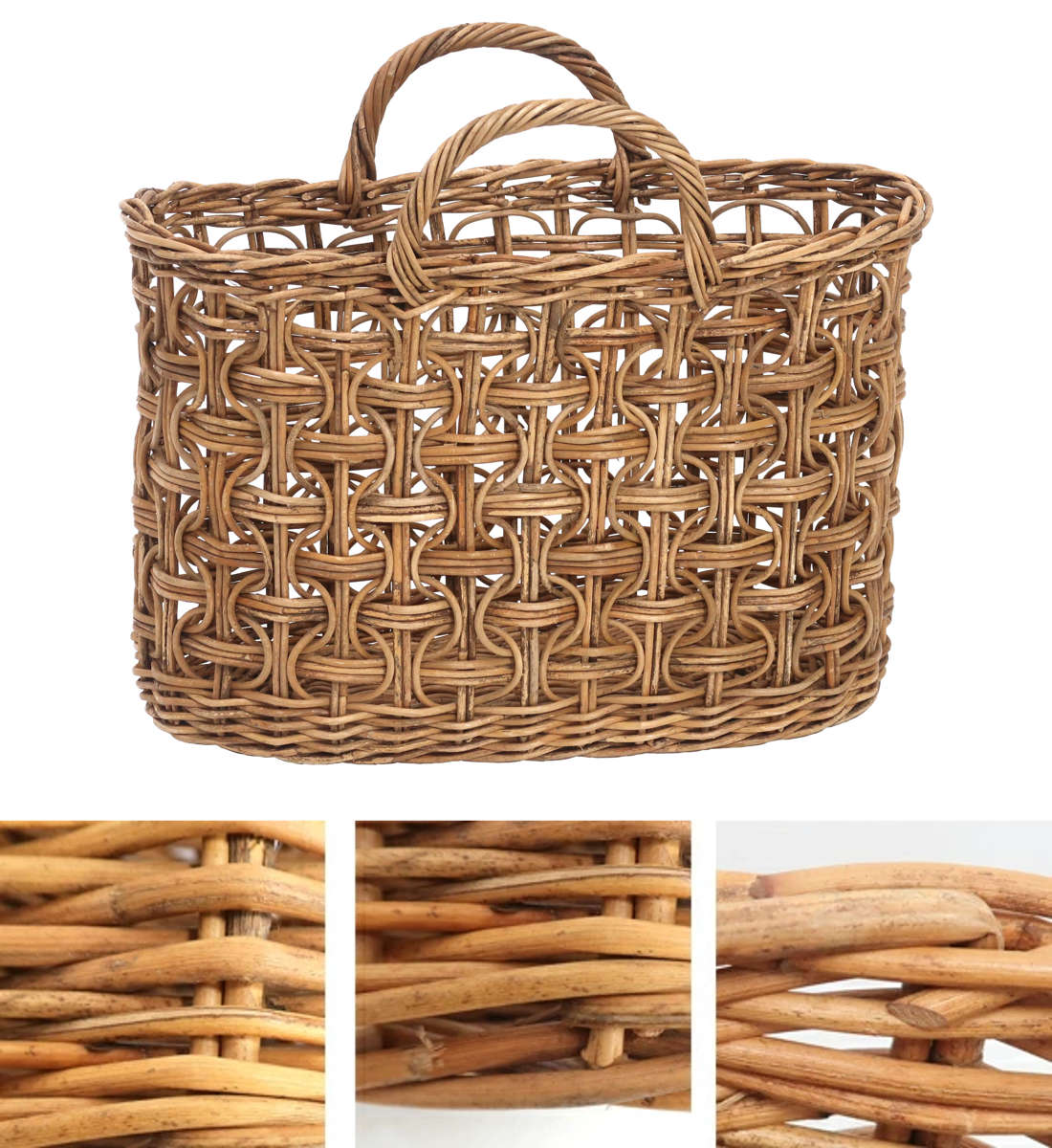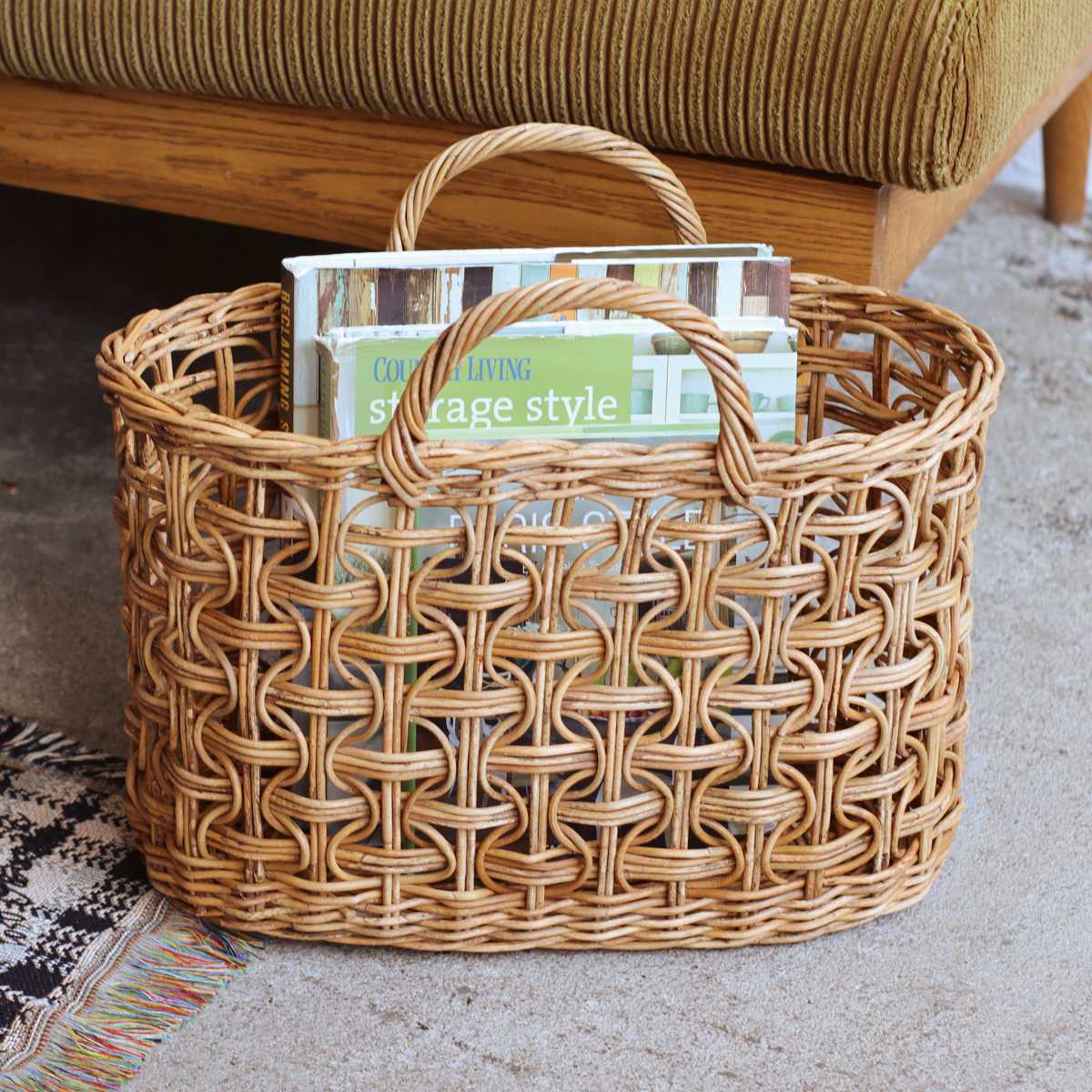 天然素材の皮付きラタンを贅沢に使用した、温かみのあるループ編みハンドルバスケットです。デザイン性の高い透かし編みがポイントで、インテリアに温かみとナチュラルな雰囲気を演出します。