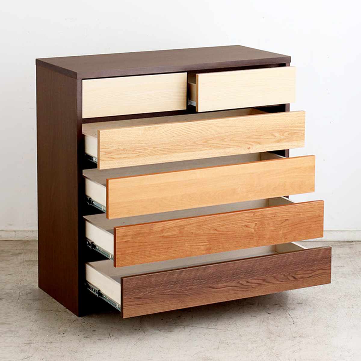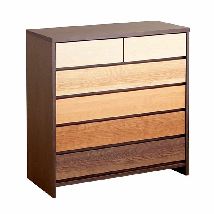 あえて違う木材カラーをグラデーションになるように設えた意匠性が目を引くチェストです。和室や洋室など置く場所を選ばず、様々なテイストのインテリアにマッチします。