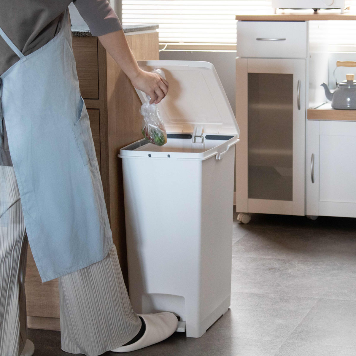 足で軽く踏むだけでサッと開くペダル式ゴミ箱です。手がふさがっていたり汚れている時でもフタを開けられるため、衛生的でとても便利です。スリッパを履いたままでも踏みやすい大きめのペダルです。