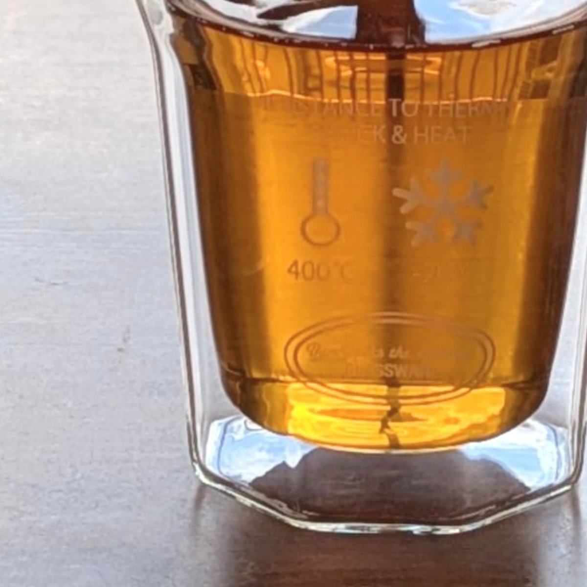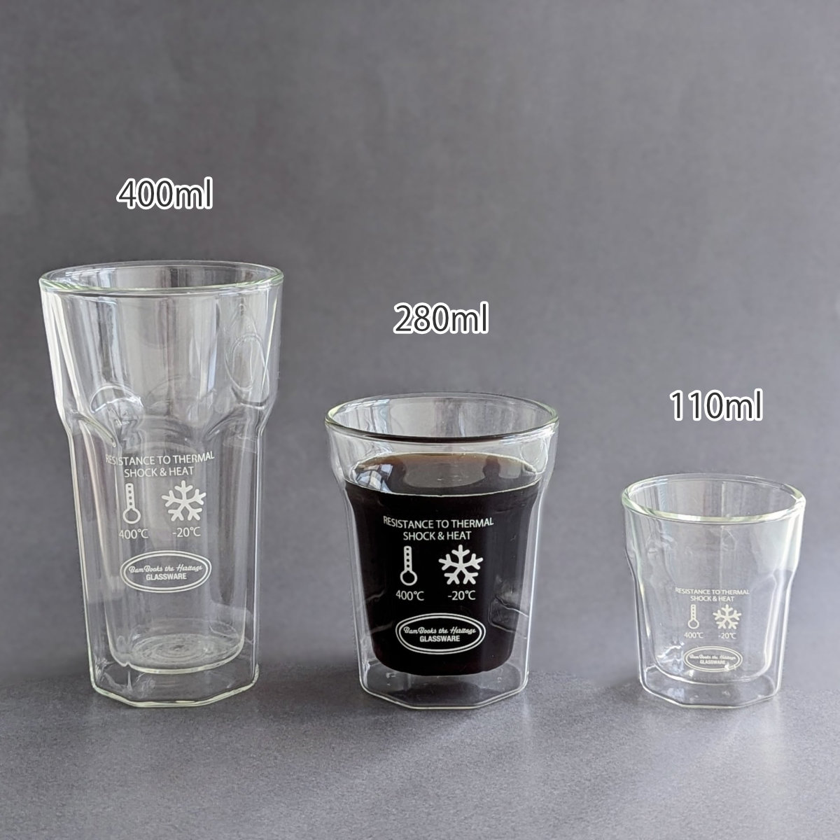 二重ガラス構造により、結露しにくく、外面が熱くなりにくい設計です。冷たいドリンクを注いでもテーブルが濡れにくく、温かい飲み物を入れても持ちやすさを保ちます。