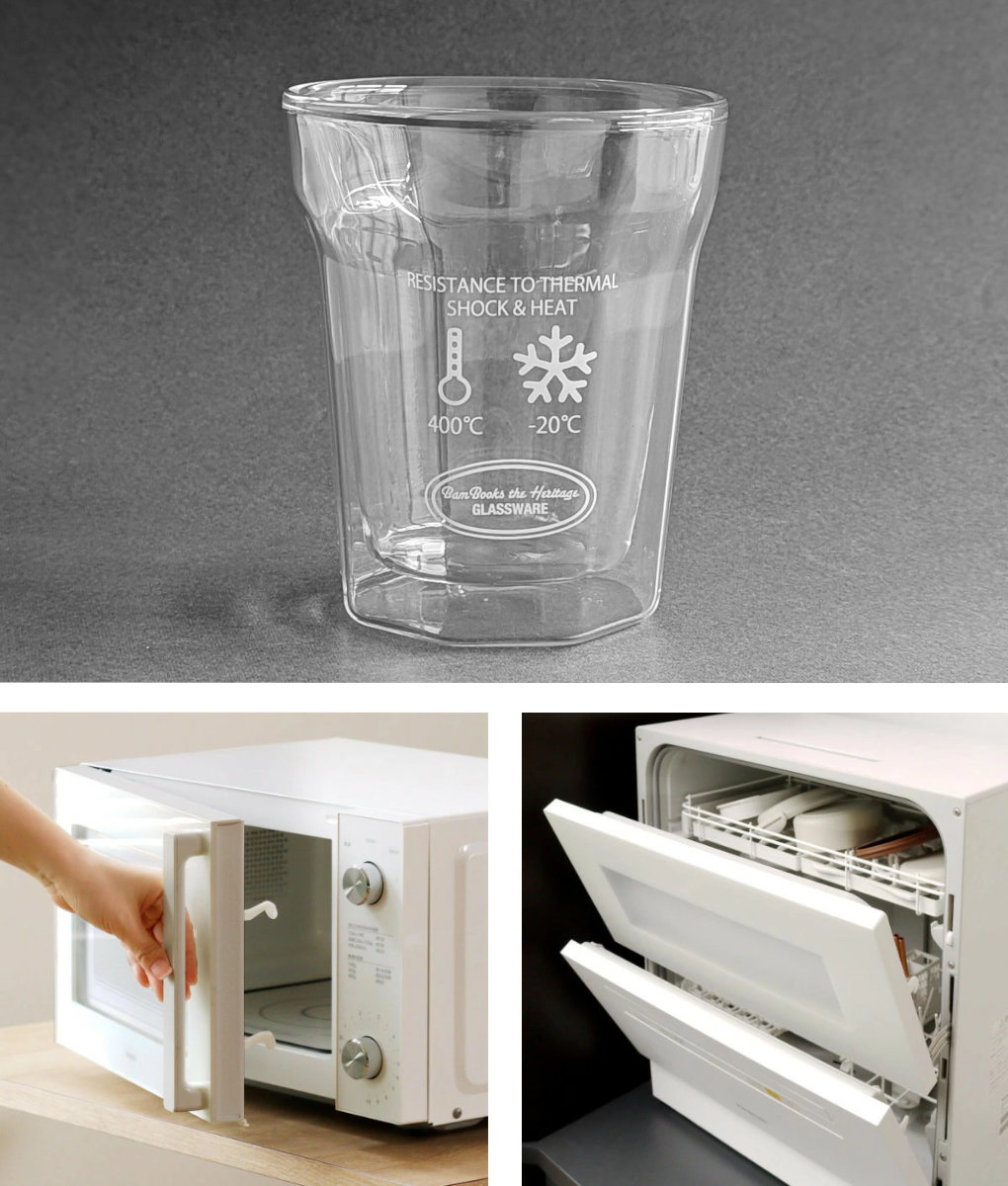 高温にも耐える耐熱ガラスだから、熱々のドリンクも安心して注げます。電子レンジでの温め直しも簡単。お手入れは食洗機でラクラクです。