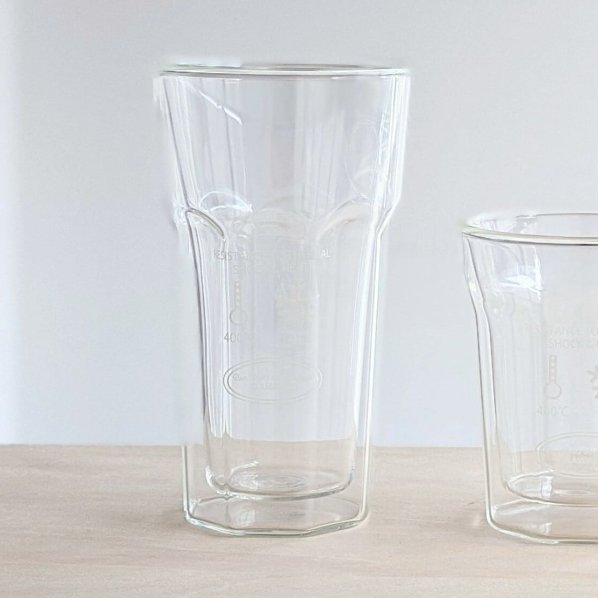 二重ガラス構造により、結露しにくく、外面が熱くなりにくい設計です。冷たいドリンクを注いでもテーブルが濡れにくく、温かい飲み物を入れても持ちやすさを保ちます。