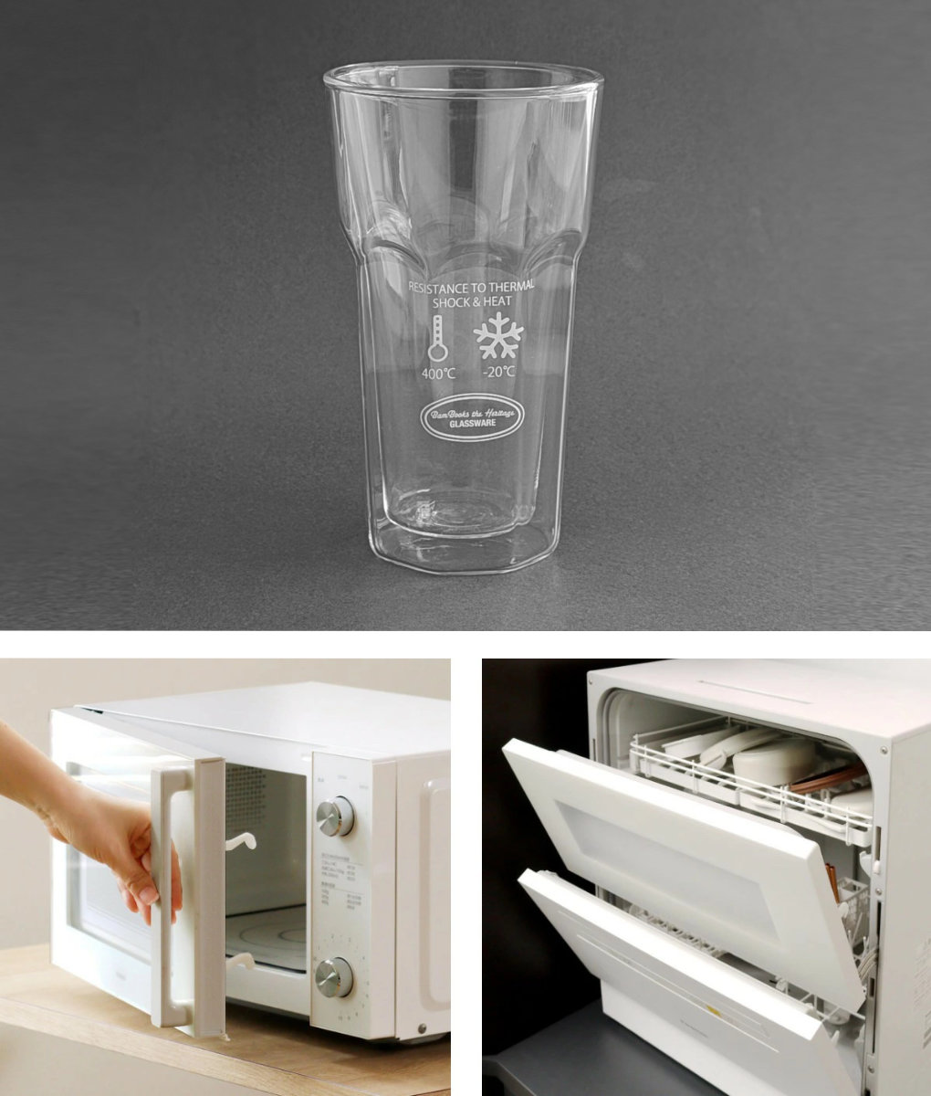 高温にも耐える耐熱ガラスだから、熱々のドリンクも安心して注げます。電子レンジでの温め直しも簡単。お手入れは食洗機でラクラクです。