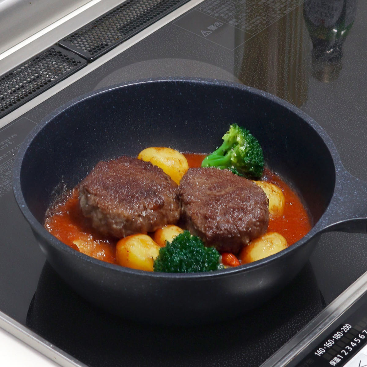 熱伝導率の高いアルミダイキャスト製です。ムラなく火が通るので、ハンバーグや分厚いお肉なども生焼けなく上手に焼けます。