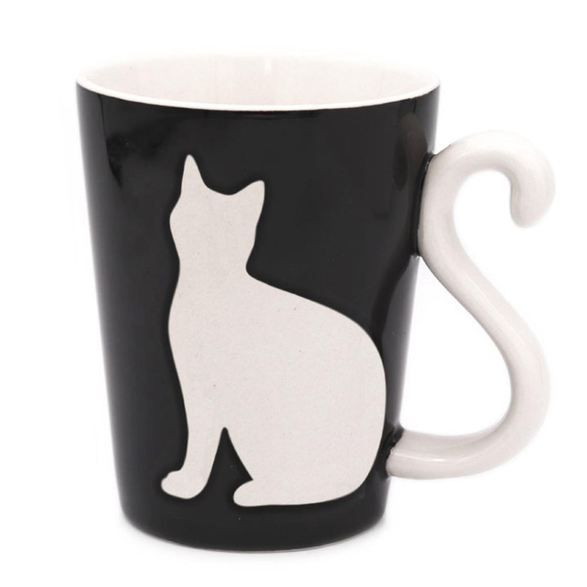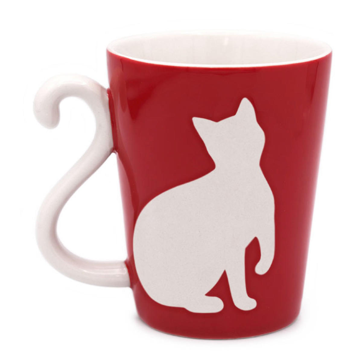 愛らしい猫のマグカップです。シンプルな中にも鮮やかな黒と赤が映えます。容量は1個あたり約300mlで、ほっと一息つくティータイムにぴったりのサイズです。