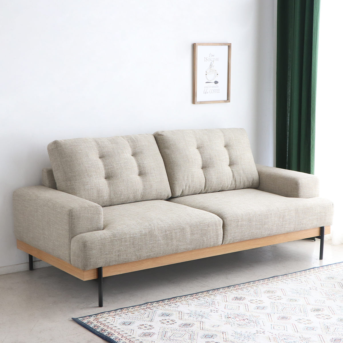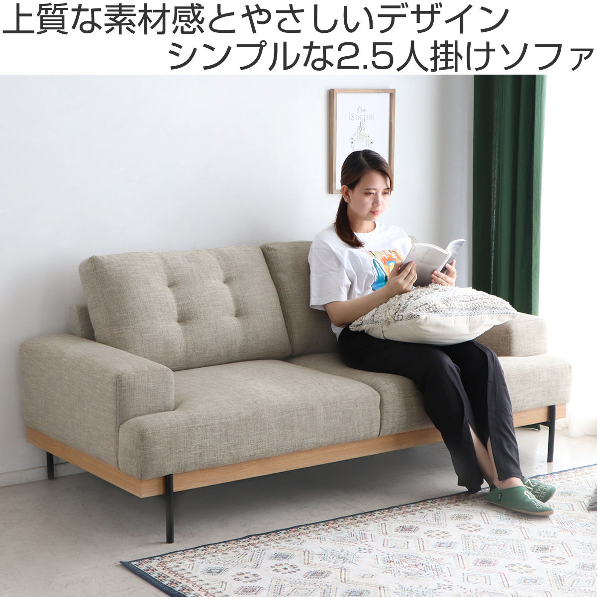 ナチュラルな木目とスチール脚のアクセントが絶妙に調和した、シンプルデザインの2.5人掛けソファです。どんなインテリアにも自然に溶け込み、お部屋を明るく上品に演出します。