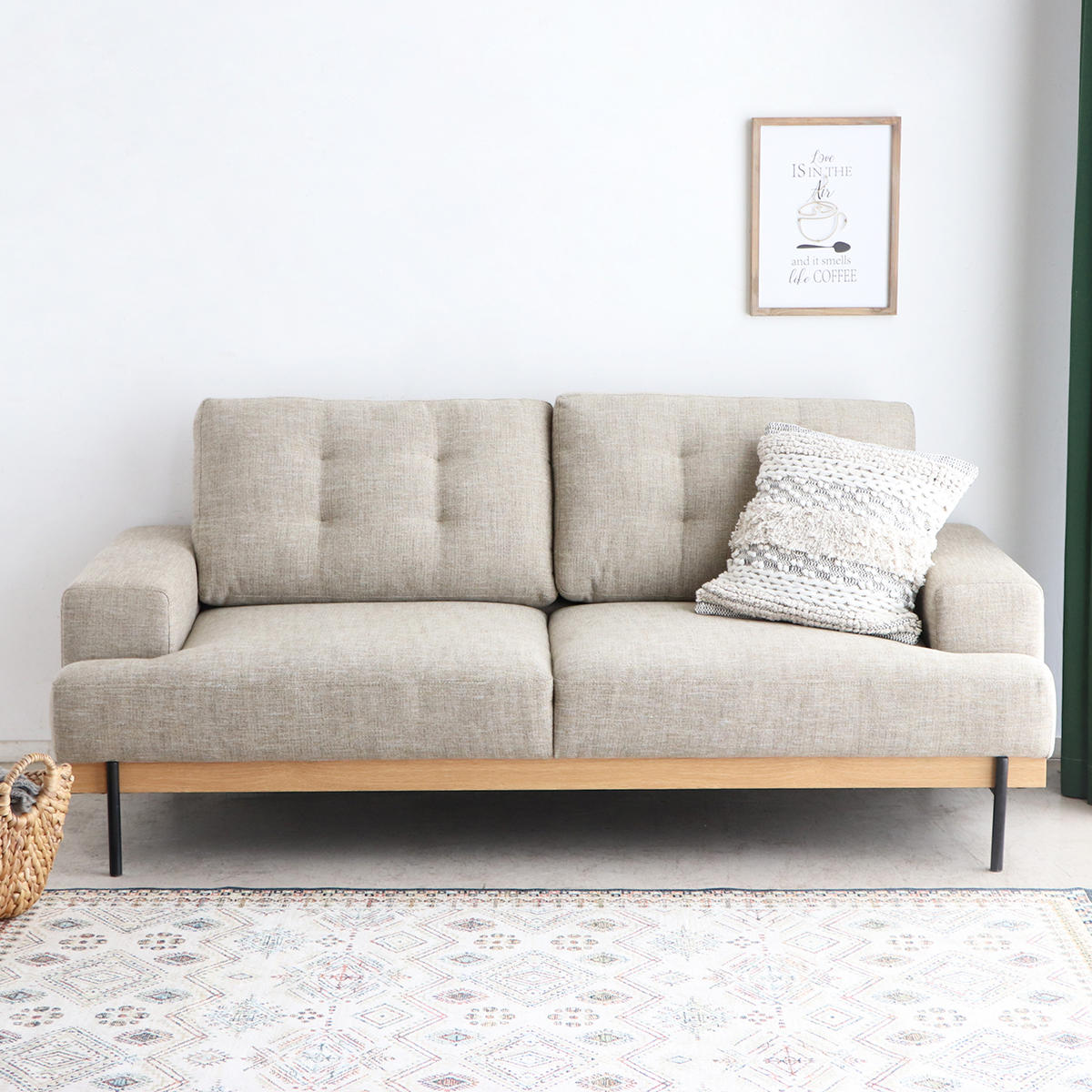 ソファ下部には、温かみのある木目フレームと、マットな質感のスチール脚を組み合わせています。異なる素材が織りなすバランスが魅力です。