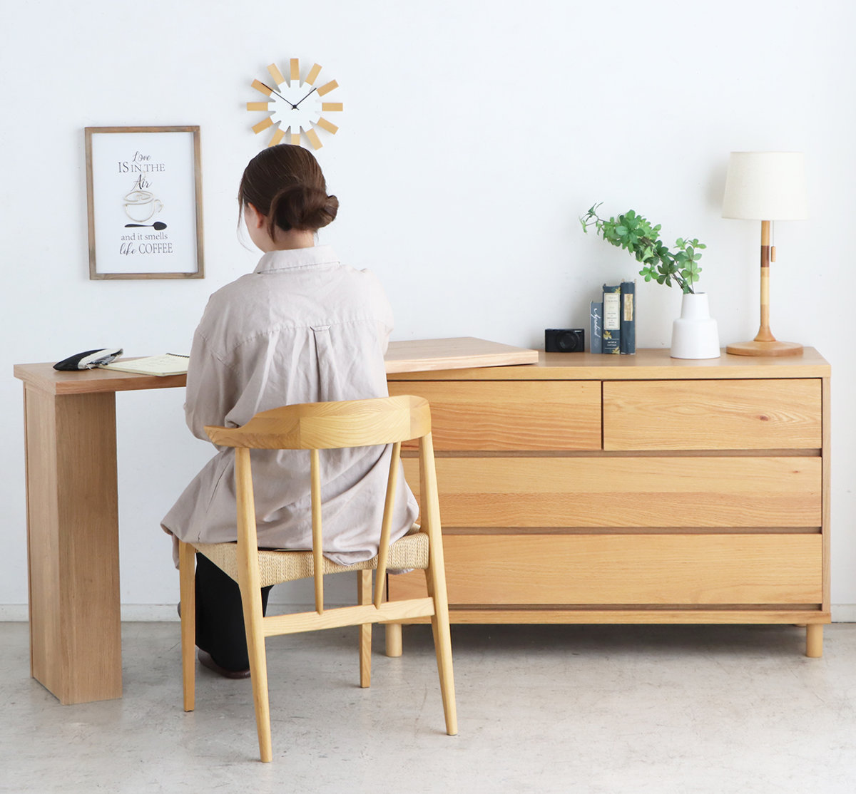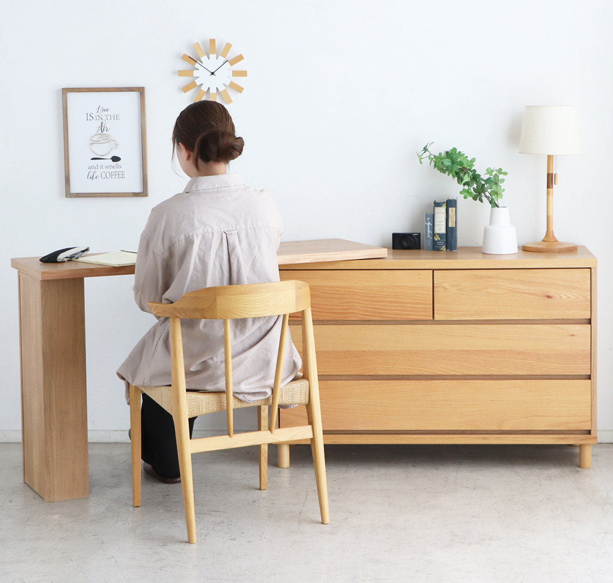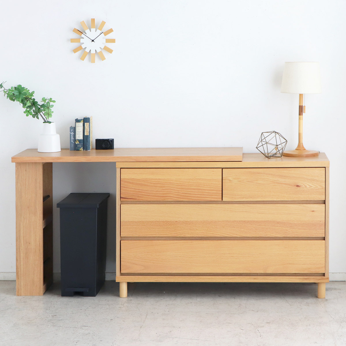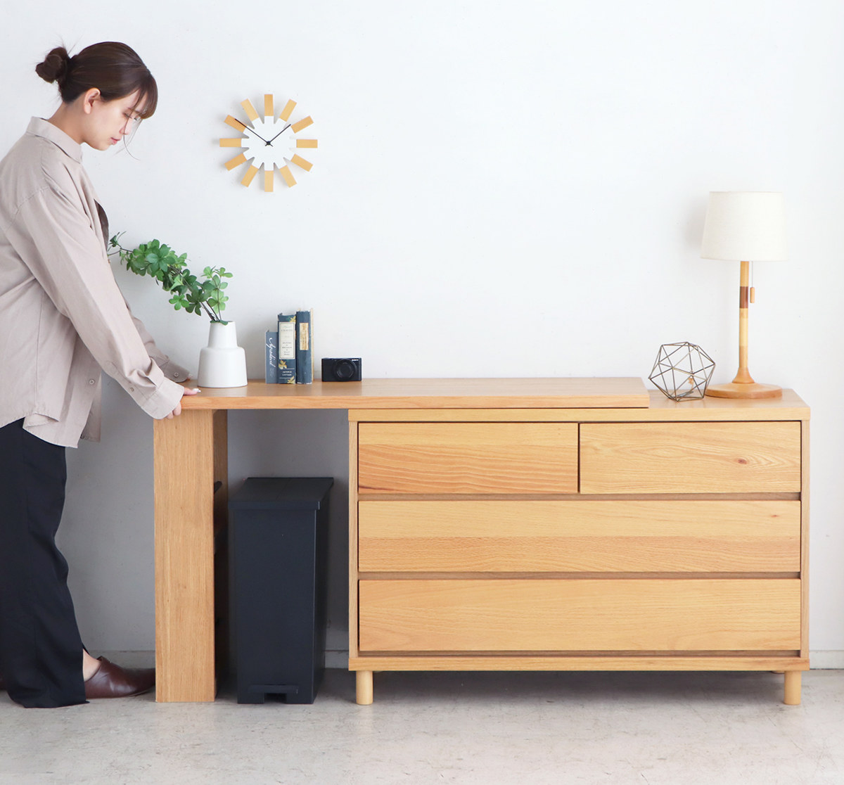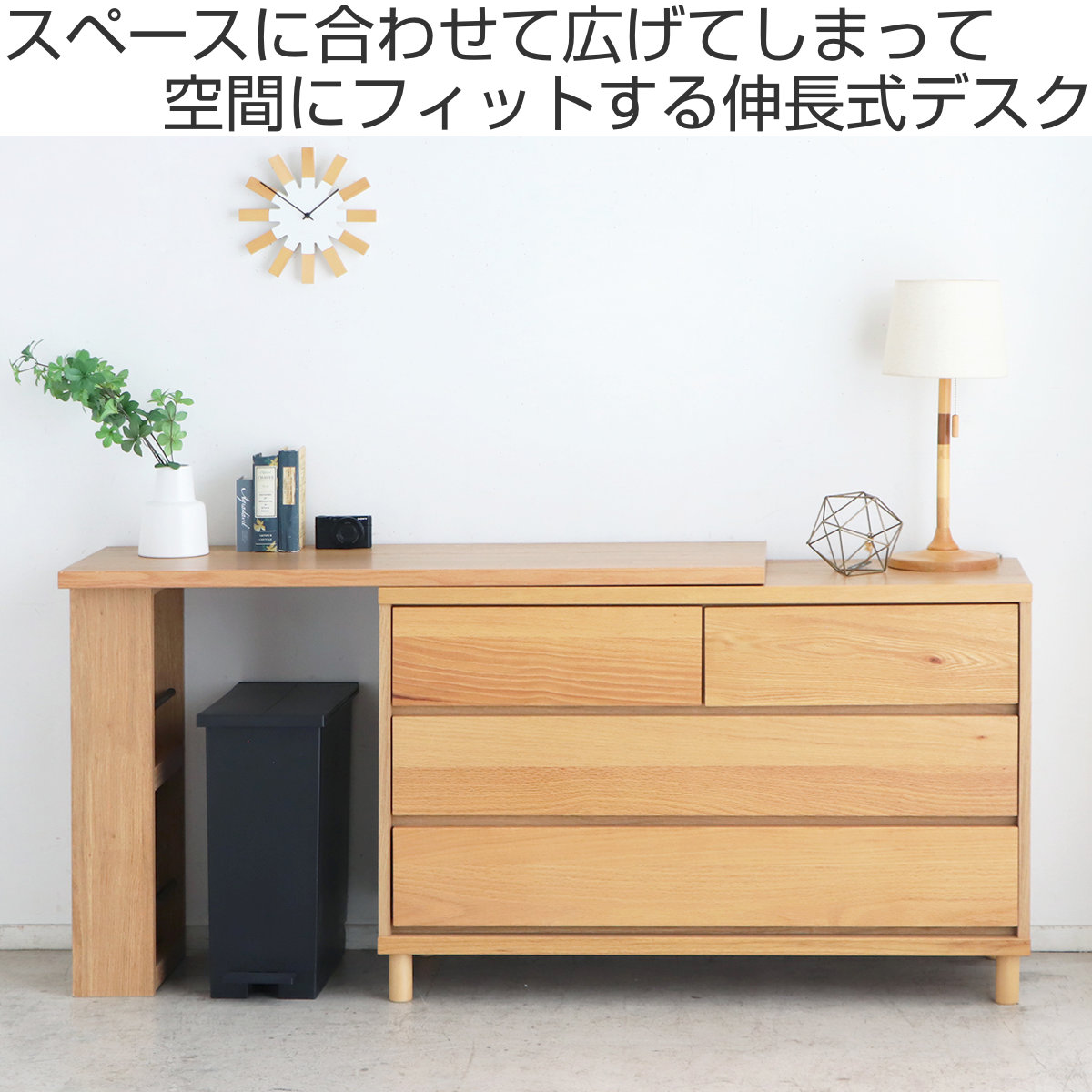 お部屋に合わせて自在にレイアウトできる伸長式デスクです。デスクを少しだけ引き出して、天板下にゴミ箱を置くなど、生活スタイルに合わせて使い方を自由にアレンジ。使わない時はすっきりと収まり、省スペースで美しい空間を保ちます。