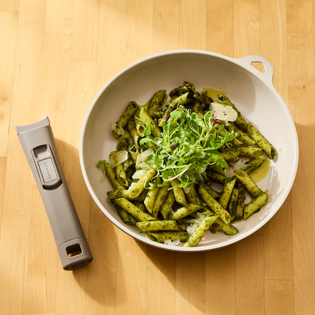 ハンドルには別売りの「SONOMA」シリーズのキッチンツールを、マグネットでくっつけられます。キッチンツールをハンドルにつけたまま調理できるので使い勝手が抜群です。立てた状態でも自立する形状です。
