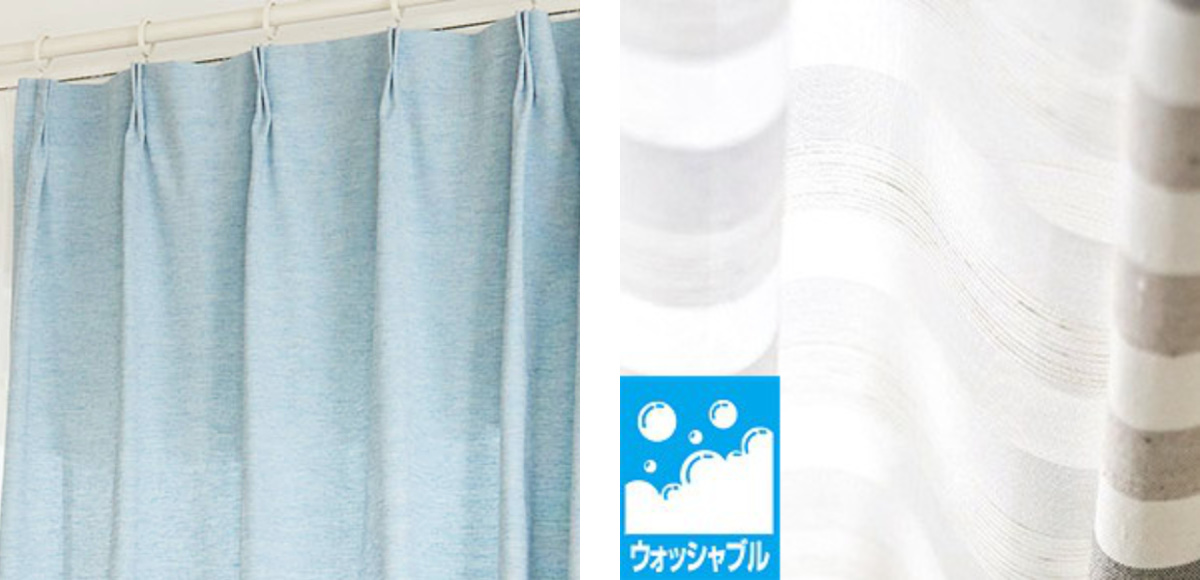ウォッシャブル ご家庭の洗濯機で洗えます。 洗濯による伸縮もほとんどな く、シワになりにくいカーテン です。 |