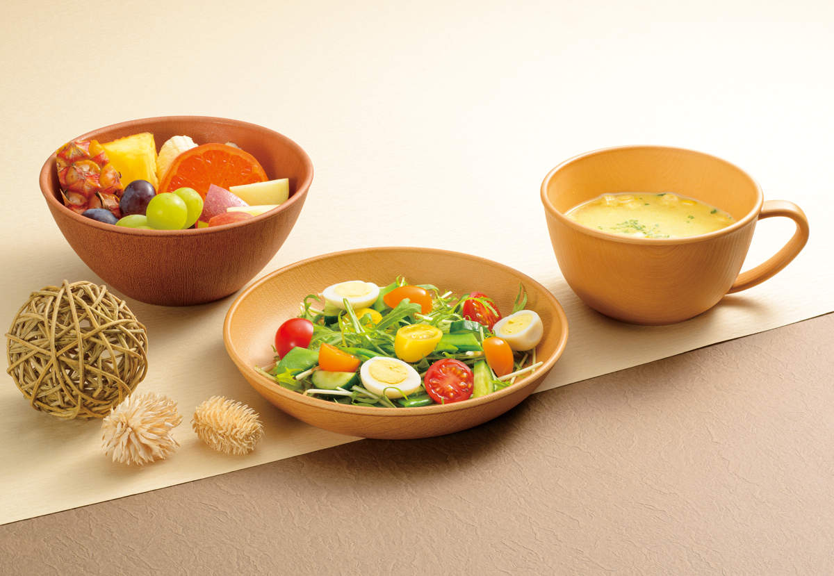 ナチュラルな木目の質感に、安心して使える抗菌機能をプラスした抗菌木目食器シリーズ。スープカップやマグカップ、ボウルやプレートなど用途に合わせて選べる豊富なラインナップが揃っています。普段使いはもちろん、パーティーやアウトドアシーンでも活躍します。