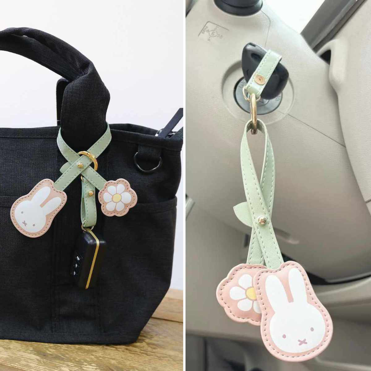 スマートキーを取り付けられる合成皮革製のキーホルダーです。ミッフィーとお花の可愛いチャーム付きです。