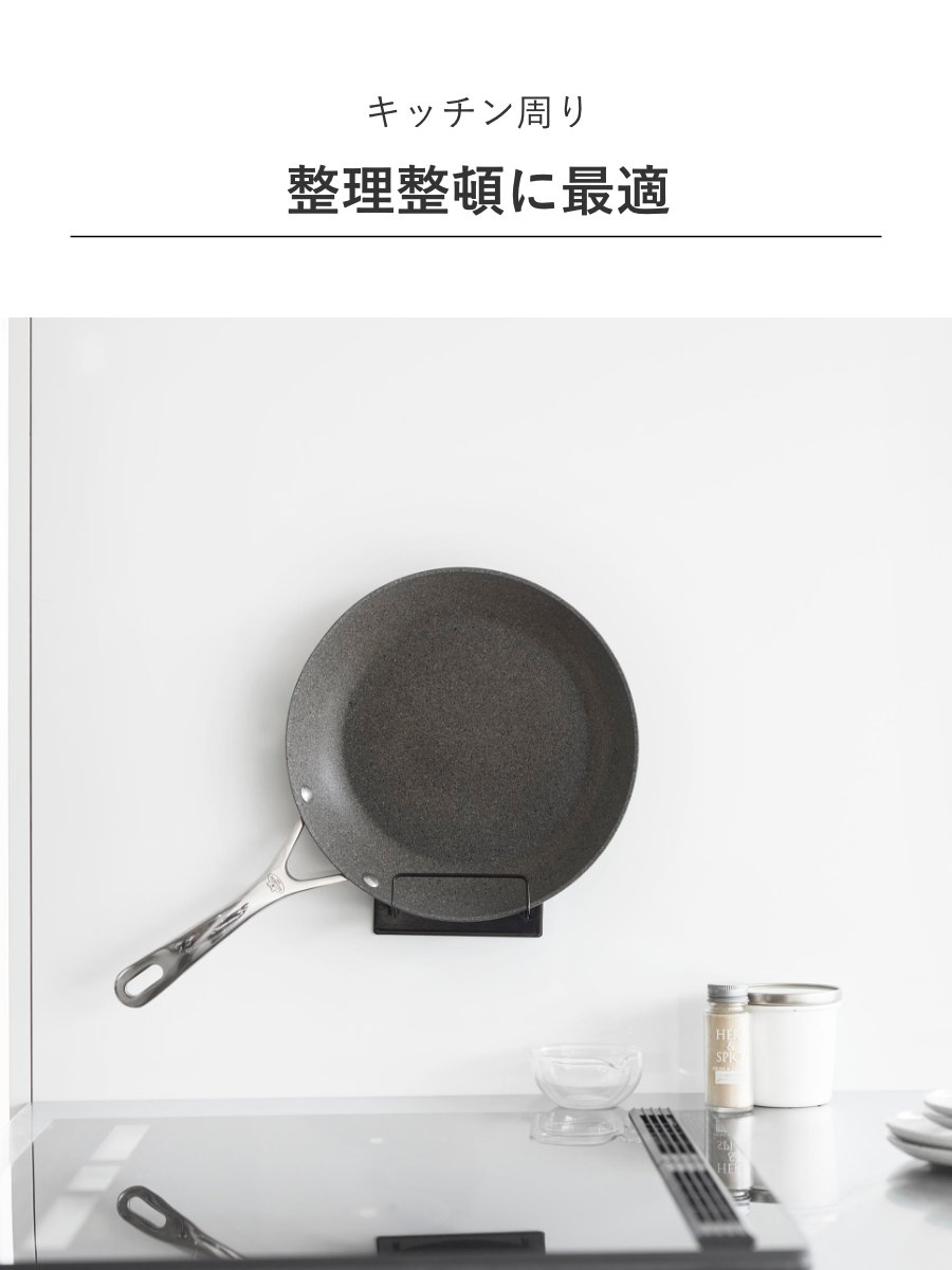 マグネット式でフライパンを壁に浮かせて収納できる、シンプルで機能的なホルダーです。磁石が使える場所に簡単に取り付けることができ、調理器具の置き場所に困りがちなキッチン空間を効率よく活用できます。