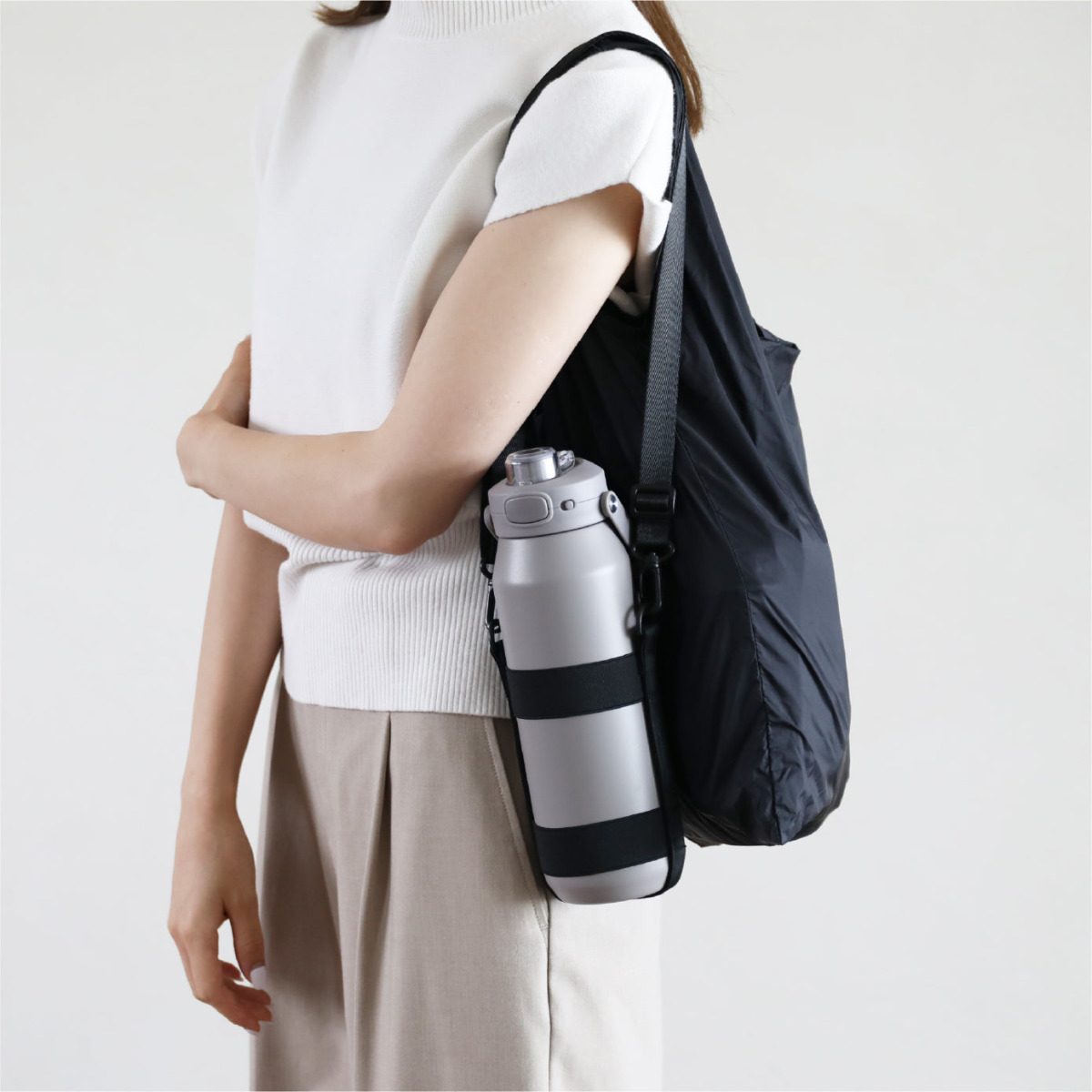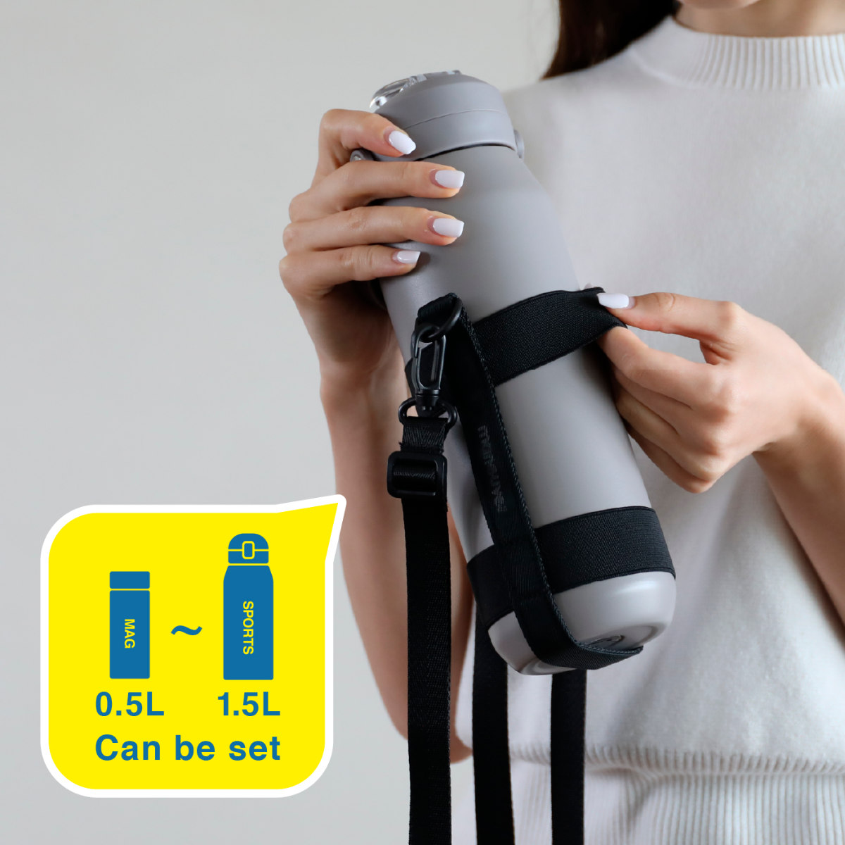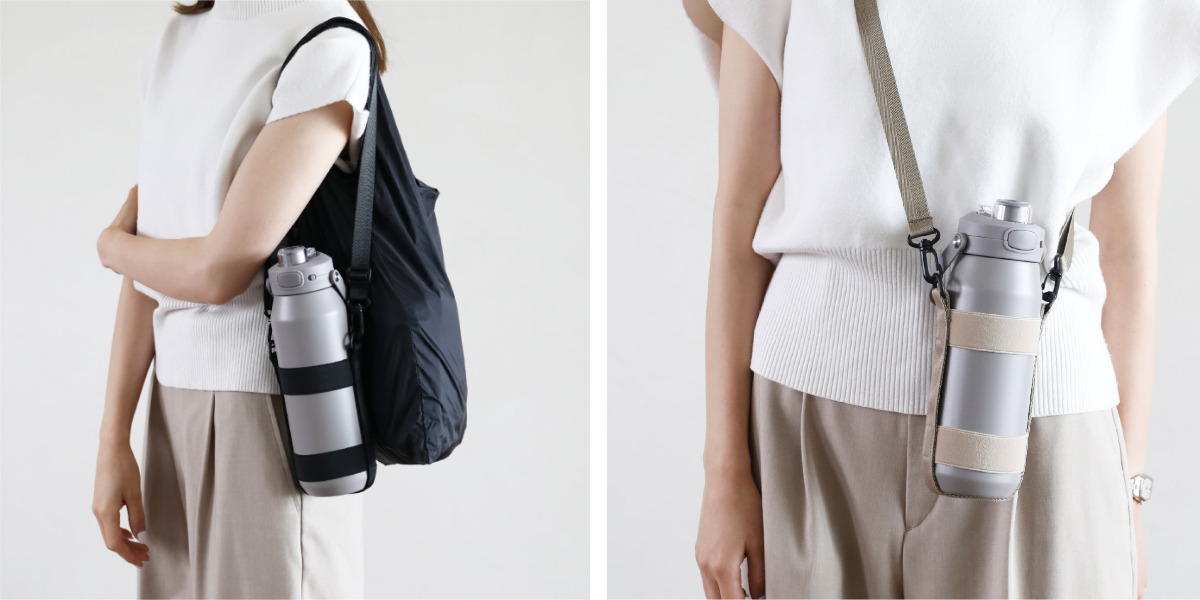 本体のベルトにゴムを採用することで、直径8~10cm×高さ20~30cmまでのボトルにフィットします。容量0.5Lから1.5Lまで幅広くお使いいただけるので、サイズごとにホルダーを揃える手間もなく、1つでまとめられるのが最大の魅力です。