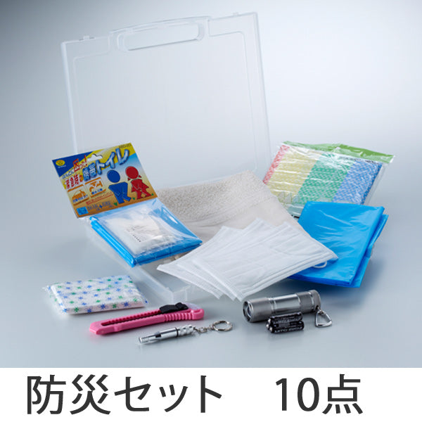 棚にすっぽり入って、持ち運び便利な防災用10点セット