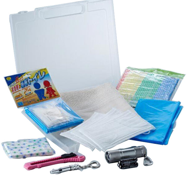 | 備考 | 内容物:A4ファイルケース、ミニアルミライト(点灯確認用電池付)、アルミホイッスル、マスク×3、携帯トイレ、タオル、カッター、レジャーシート、ポリ袋、ポケットティッシュ ※セットの商品は、カラー・仕様等が写真と異なる場合があります。 |