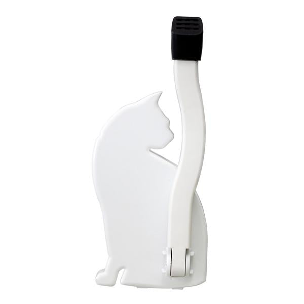 ![]() (2)補助板に本体の突起部分を斜めに当て、そのまま下へ滑らせます。※指をはさまないように猫の頭を持って取り付けてください。 |