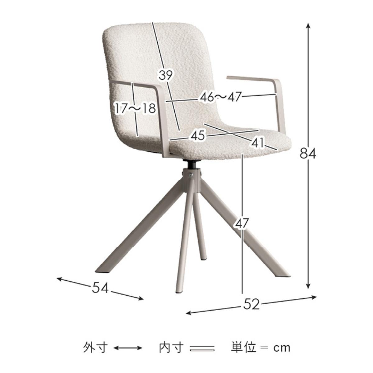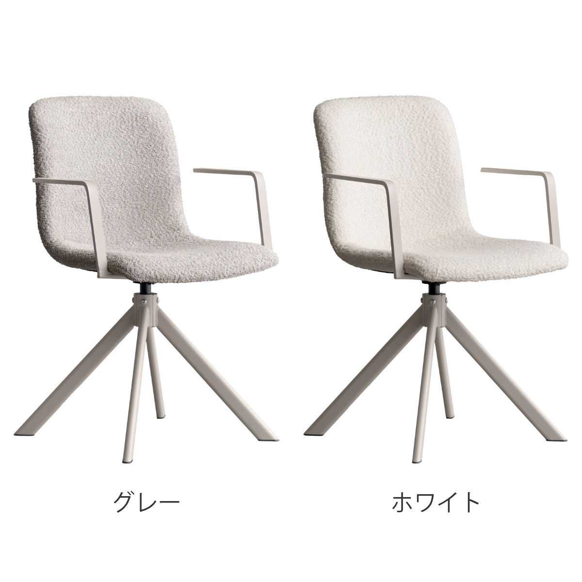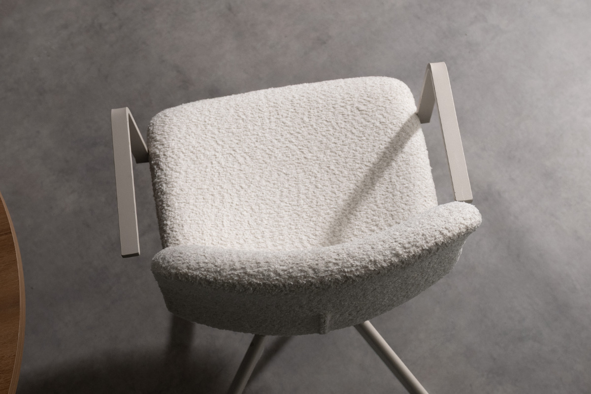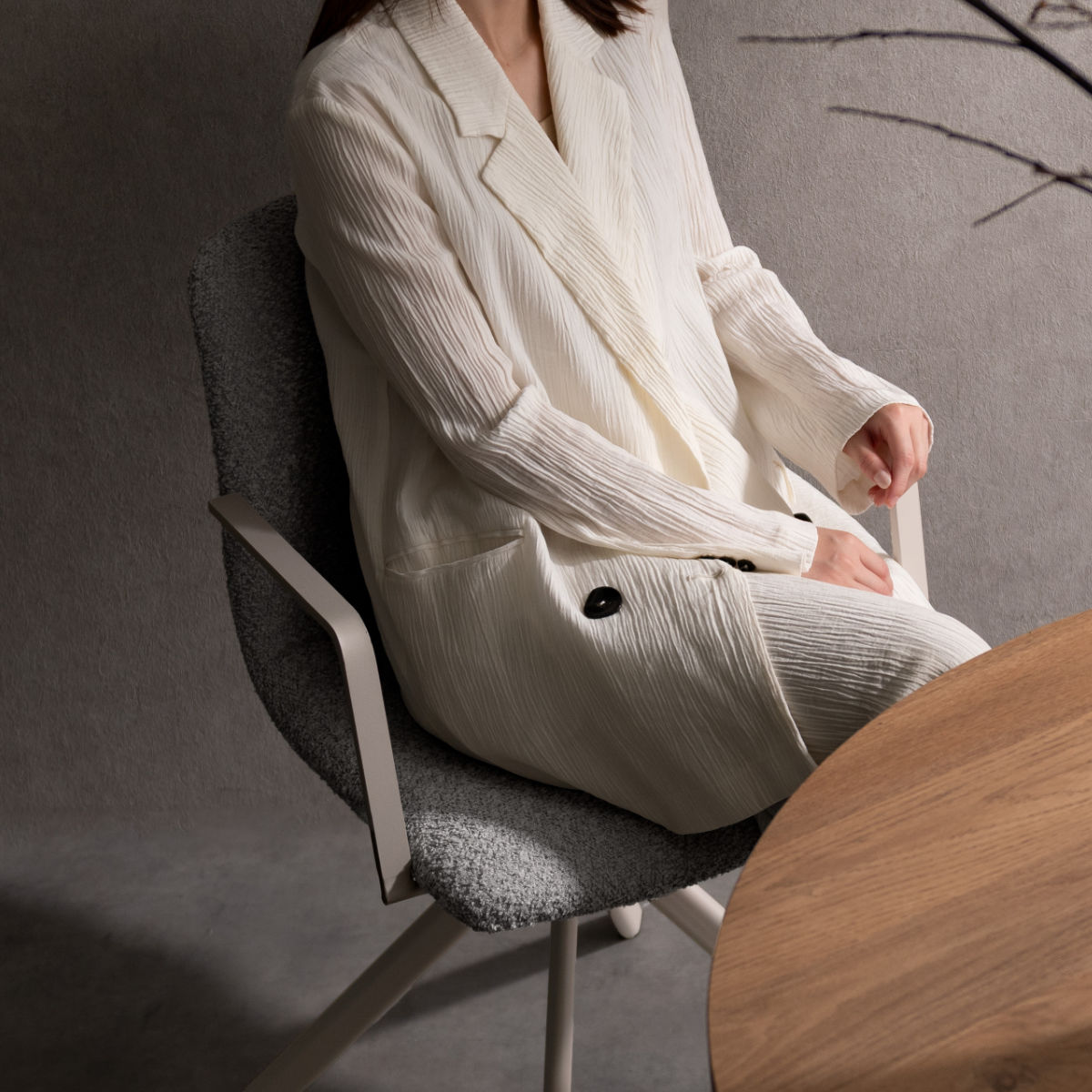 シャープなアームが美しいダイニングチェアです。光の角度によって表情を変えるブークレ生地と直線的なアームレストが、空間に上質でモダンな印象を与えます。デザインと機能性を兼ね備えたチェアが日々の暮らしをより優雅で心地よいものにしてくれます。