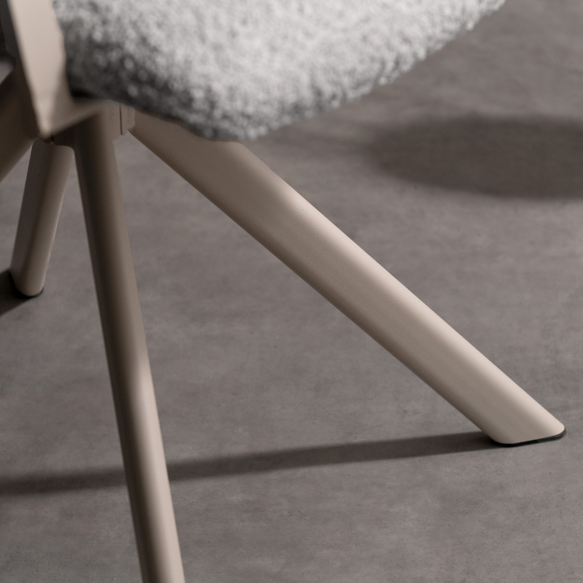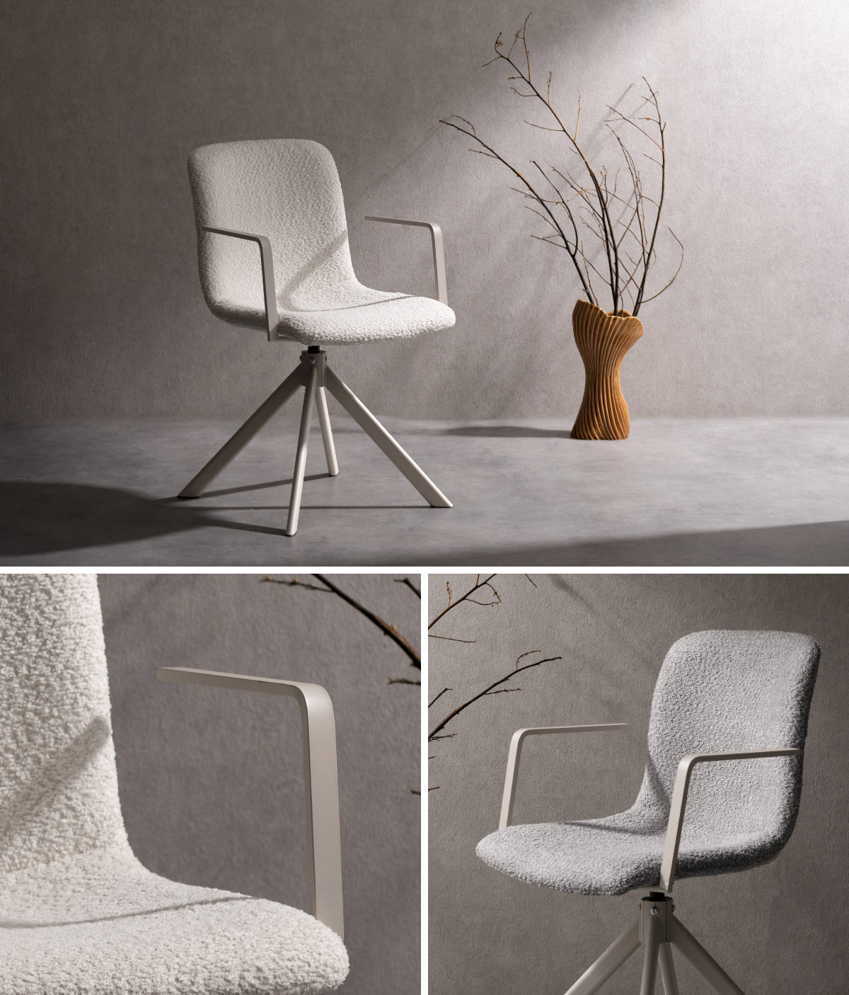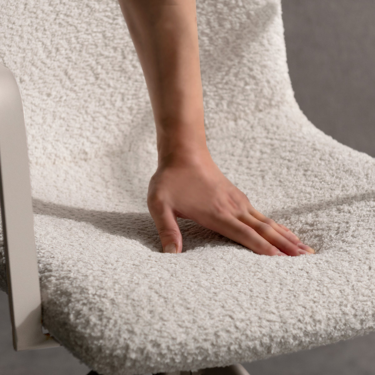 シャープなアームが美しいダイニングチェアです。光の角度によって表情を変えるブークレ生地と直線的なアームレストが、空間に上質でモダンな印象を与えます。デザインと機能性を兼ね備えたチェアが日々の暮らしをより優雅で心地よいものにしてくれます。