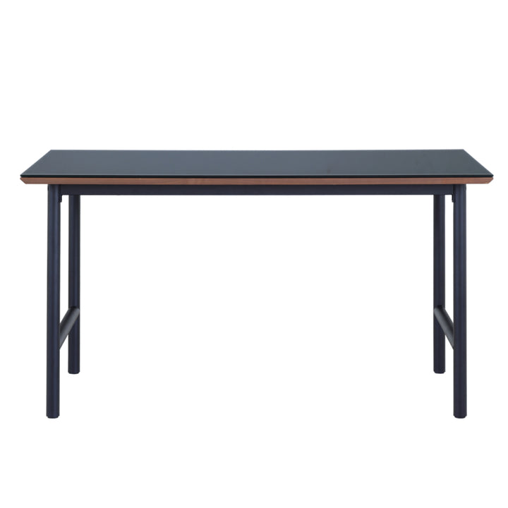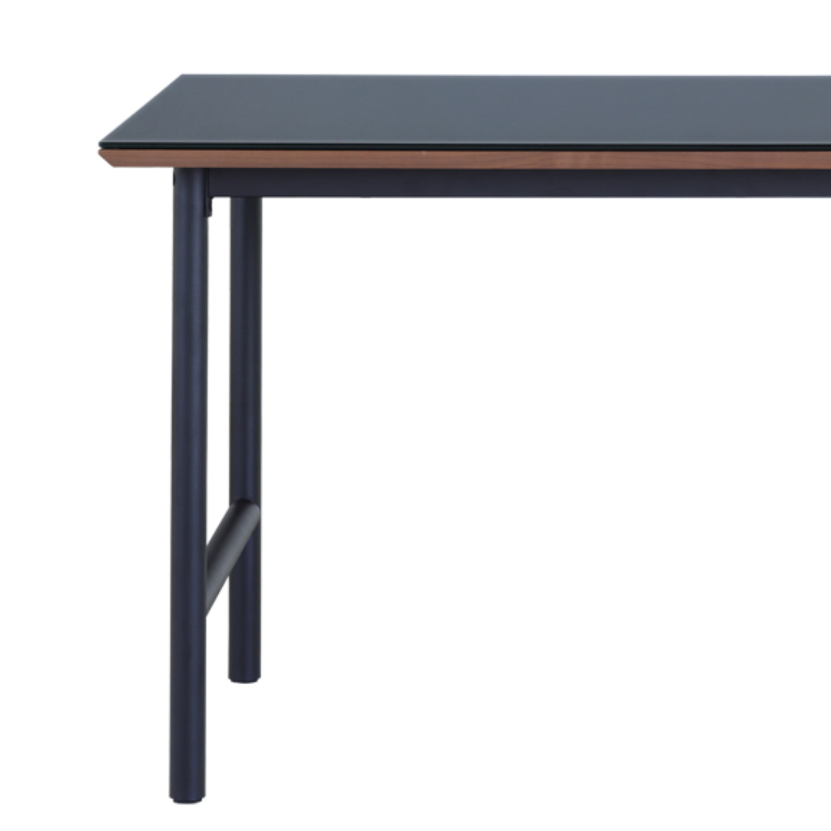 | 材質 | 天板:6mm厚強化ガラス(飛散防止フィルム加工) ガラス天板下:中質繊維板(前面木口:ウォールナット突板、表裏面:プリント紙化粧)、ラッカー塗装 脚・フレーム:スチール |