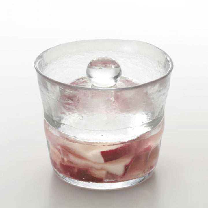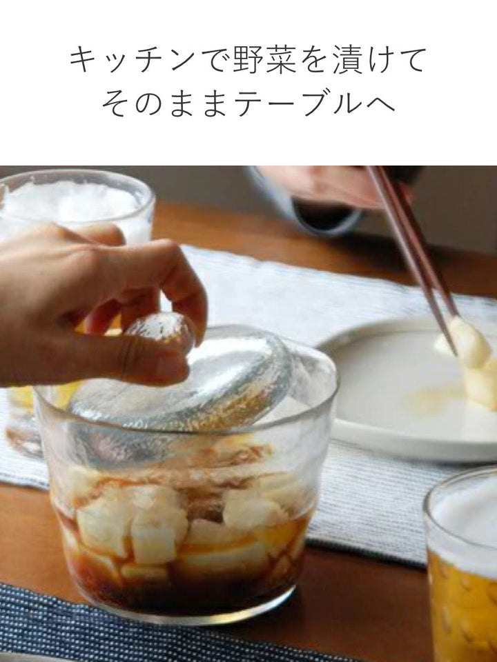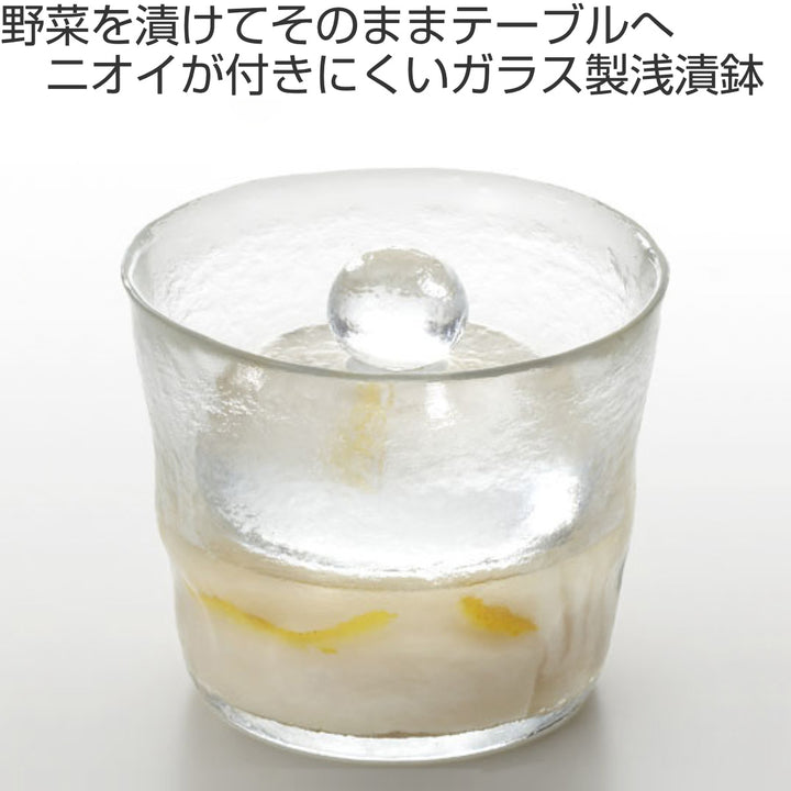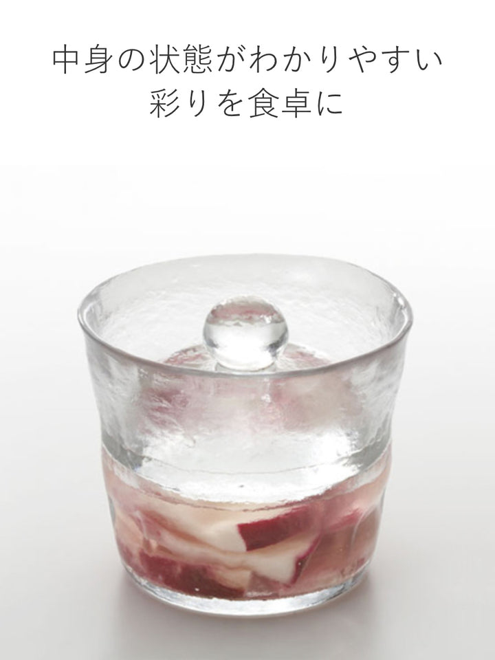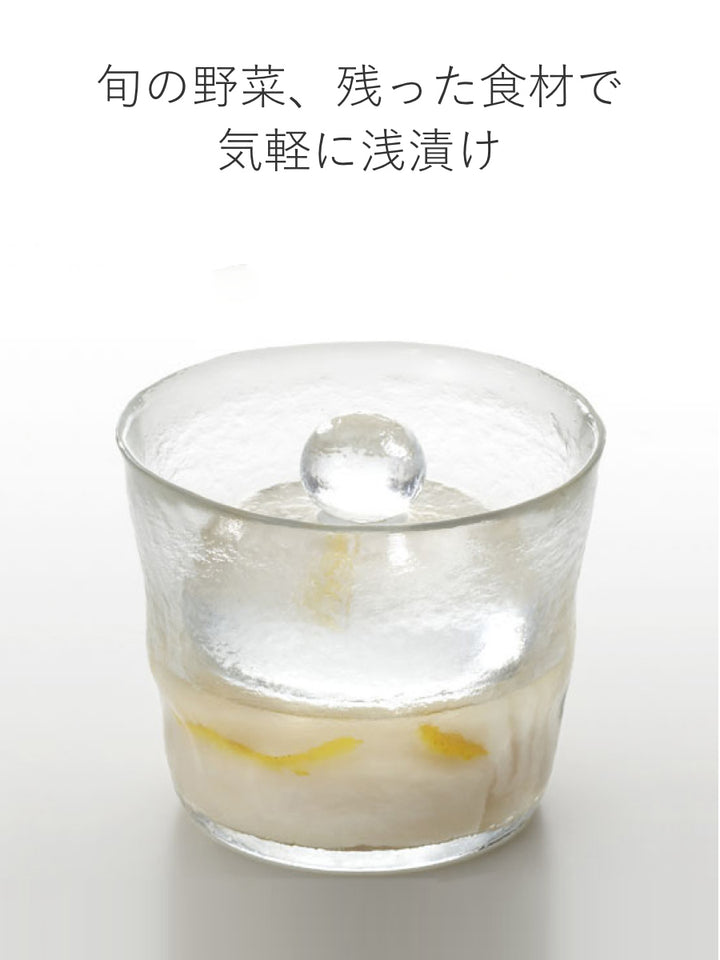 野菜をキッチンで漬けてそのままテーブルへ出せる、ガラス製浅漬鉢380mlです。旬の野菜や残った食材を使ってささっと気軽に浅漬けを楽しめます。手作りガラスならではのやわらかい雰囲気も魅力で、中身の状態がわかりやすく、食材の彩りを食卓に取り込めます。