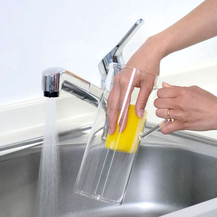 広口形状なので奥までしっかり手を入れて洗えます。シリコーンパッキンが付いているので中身がこぼれにくくなっています。また、パッキンの向きを調節することでふたをジャグ本体から外さずにスムーズに注ぐことが可能です。パーツが少ないのでお手入れも簡単に行えます。