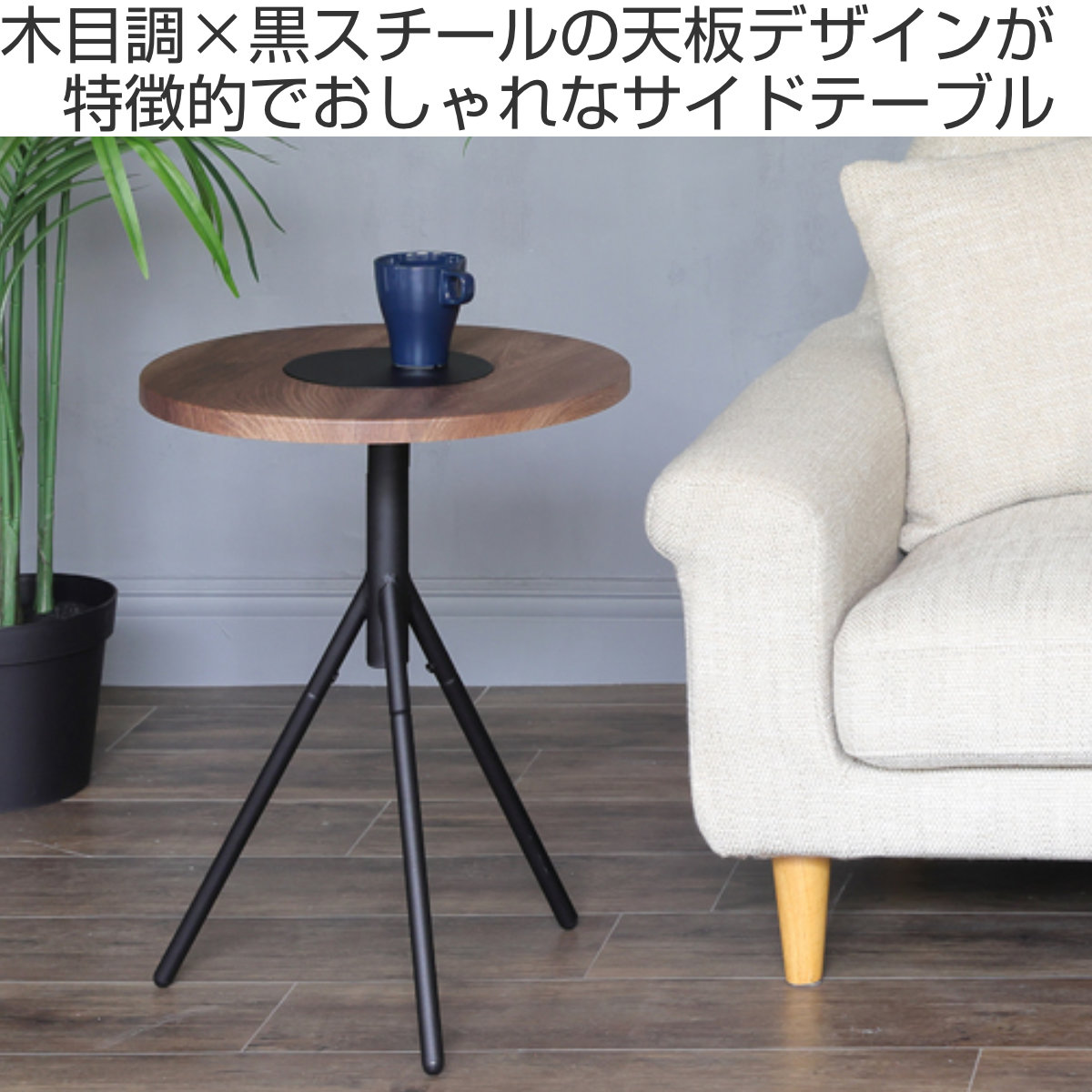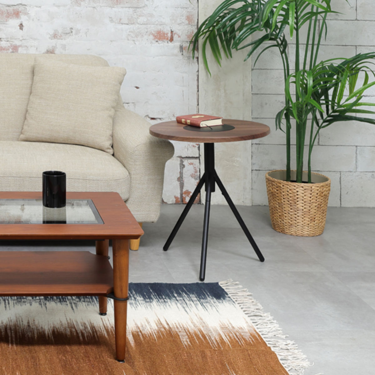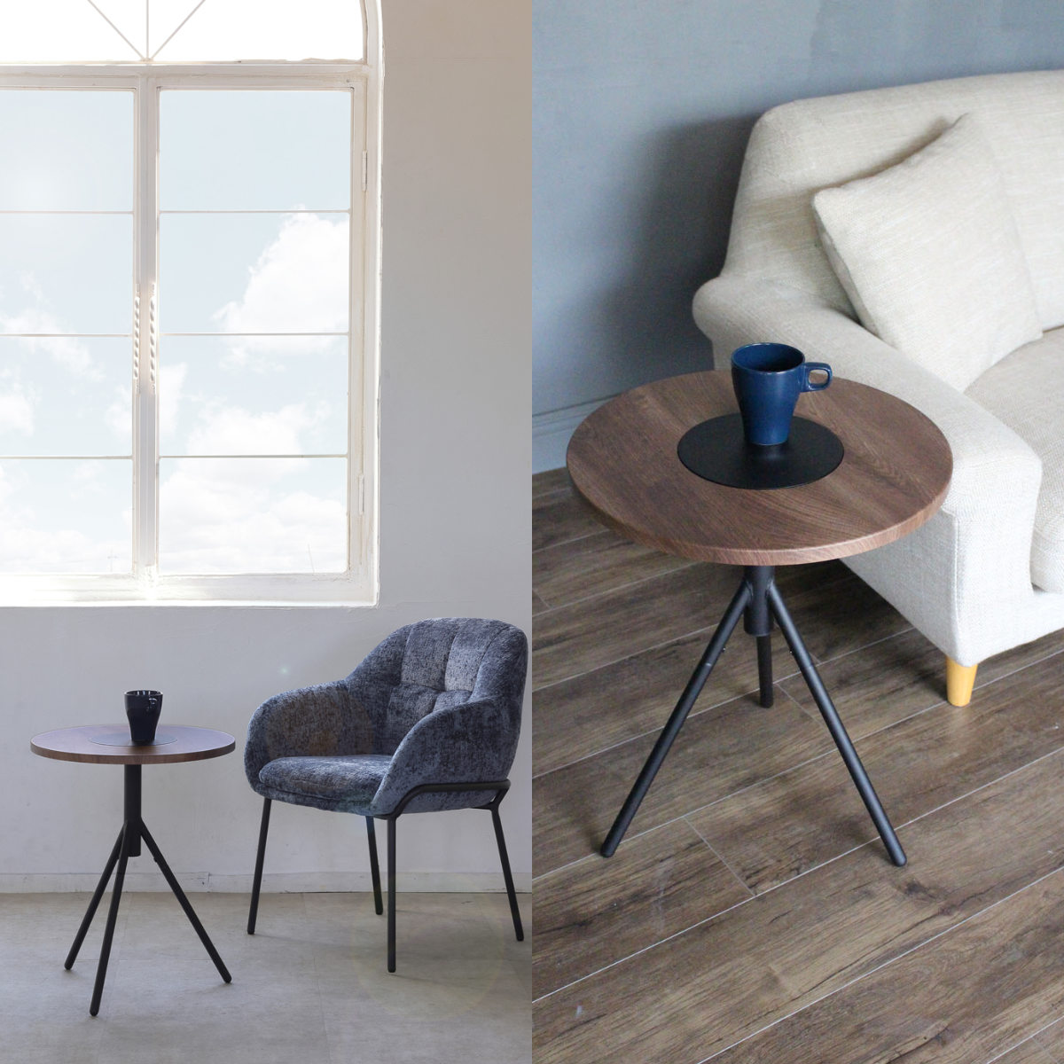 落ち着いた木目調とブラックスチールを組み合わせた丸天板のサイドテーブルで、主張しすぎないシンプルさが魅力。ナチュラルからインダストリアル、モダンまで幅広いインテリアに馴染みます。