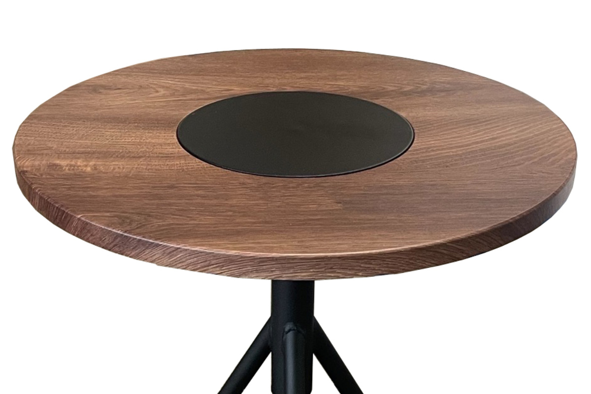 天板は板には水や汚れに強い素材を使用し日常使いにも安心です。天板中央には 直径19cmのスチールプレートを埋め込まれており、熱に強くデザインとしてもアクセントになっています。