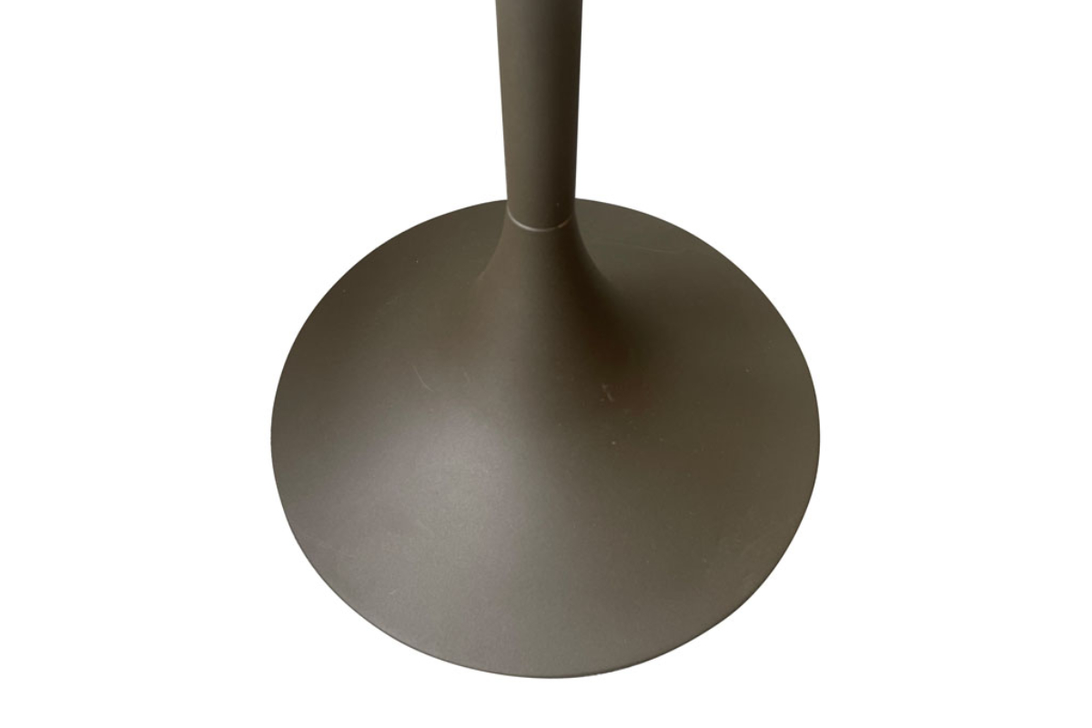 支柱から脚元へと流れるようにつながる曲線デザインが美しいサイドテーブルです。脚部にはブラックに近いダークブラウンのスチールを採用し、落ち着きと高級感を演出します。さらに、台座と床の設置面積を広く取った構造で、見た目だけでなく安定感にも優れています。