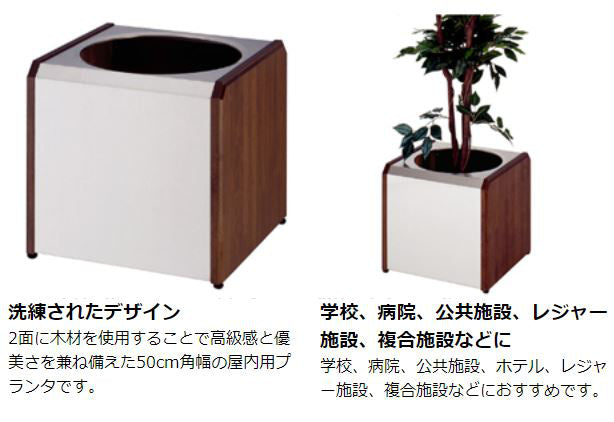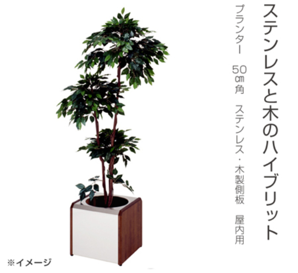 洗練されたデザイン 2面に木材を使用することで高級感と優美さを兼ね備えた50cm角幅の屋内用プランタです。 |