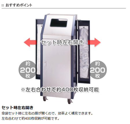 傘袋セット時に左右の扉が開くので、効率よく補充できます。左右合わせて約400枚収納が可能です。