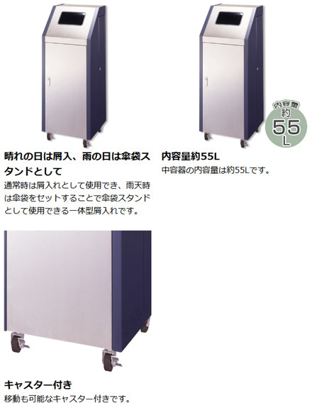 ![]() 晴れの日は屑入、雨の日は傘袋スタンドとして 通常時は屑入れとして使用でき、雨天時は傘袋をセットすることで傘袋スタンドとして使用できる一体型屑入れです。 |