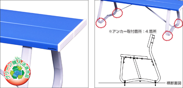 | 材質 | 座板/ABS樹脂(再生15%) 脚・受金具・内枠・支え/スチール(粉体塗装) 板キャップ/ABS樹脂、補強パイプキャップ/ポリプロピレン、床当たり/ポリエチレン |