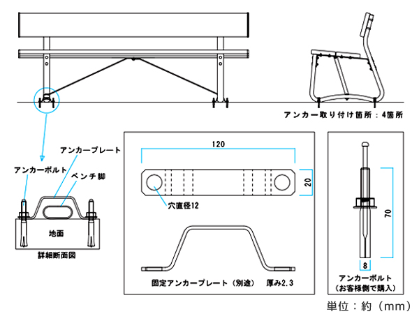 ◆ベンチの形状によってアンカーの取り付け位置や形状が異なりますのでご注意下さい。