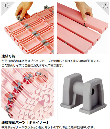 連結接続パーツ「ジョイナー」 軟質ジョイナーがクッション性とマットのずれ防止に効果を発揮します。 | ||