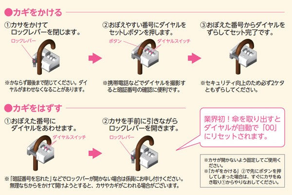 傘を取り出した際に、ダイヤルのキーナンバーが自動で「00」にリセットされます。そのため、後で別の人が使用する時にも、自由な暗証番号に設定しやすくなっています。