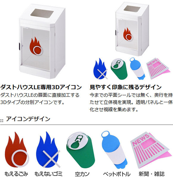 ![]() ダストハウスLE専用3Dアイコン ダストハウスLEの扉面に直接加工する3Dタイプの分別アイコンです。 |