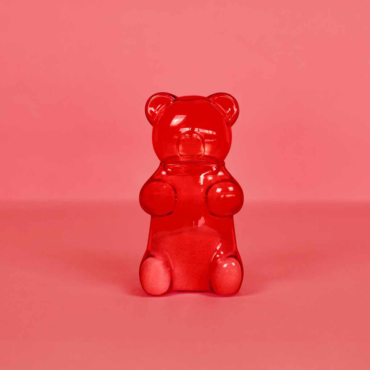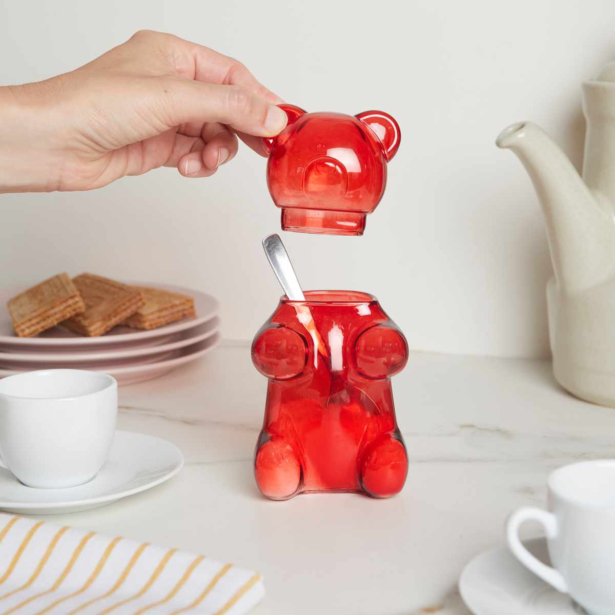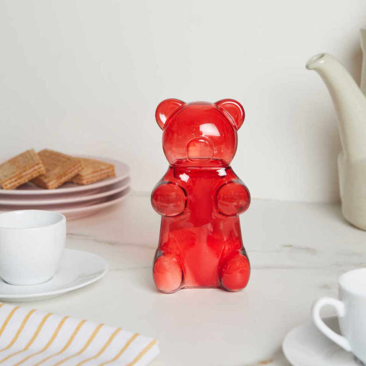 ガラスで作られた大きなグミベア型の調味料入れです。頭がフタになっており、中身が透けて見えるデザインです。置くだけでキッチンやテーブルがポップで可愛い雰囲気になります。