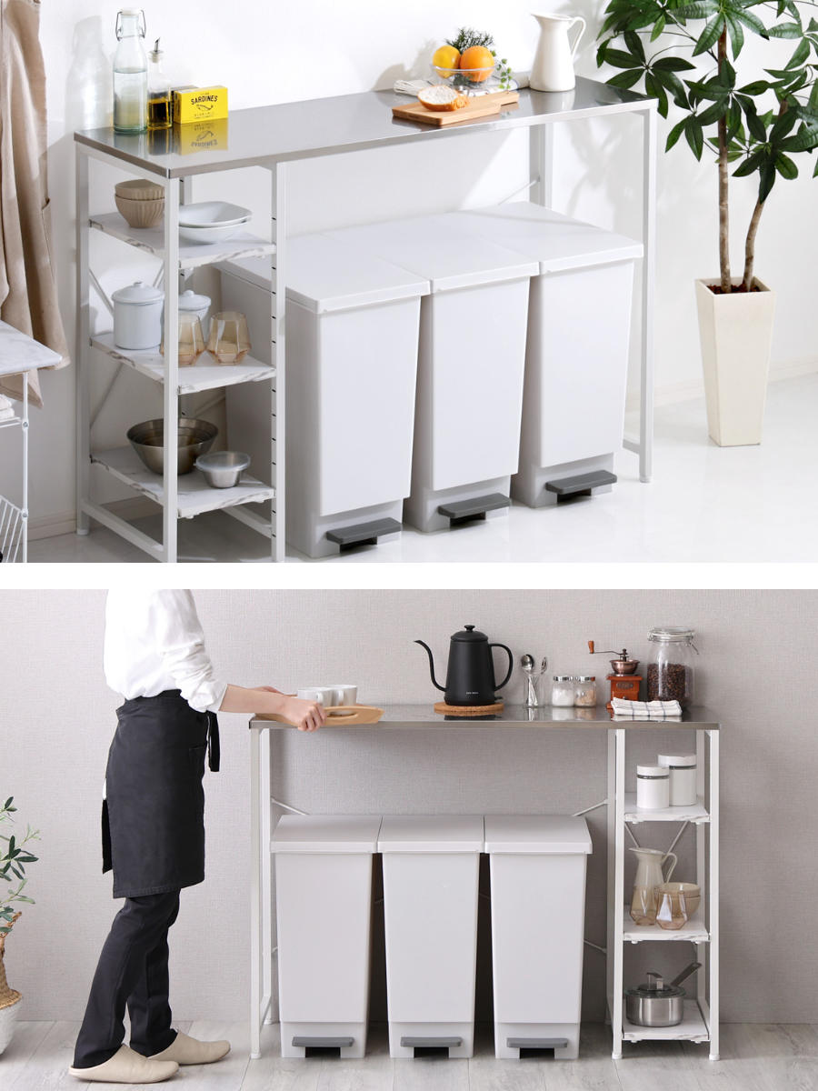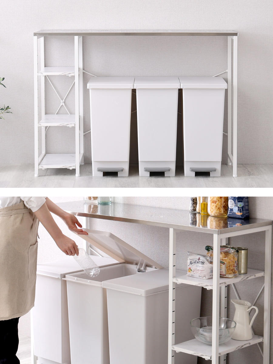 45Lスリムタイプのゴミ箱(幅26.5×奥行45×高さ55cm)を3つ並べて収納可能です。高さも十分あり、蓋の開け閉めにも邪魔になりません。