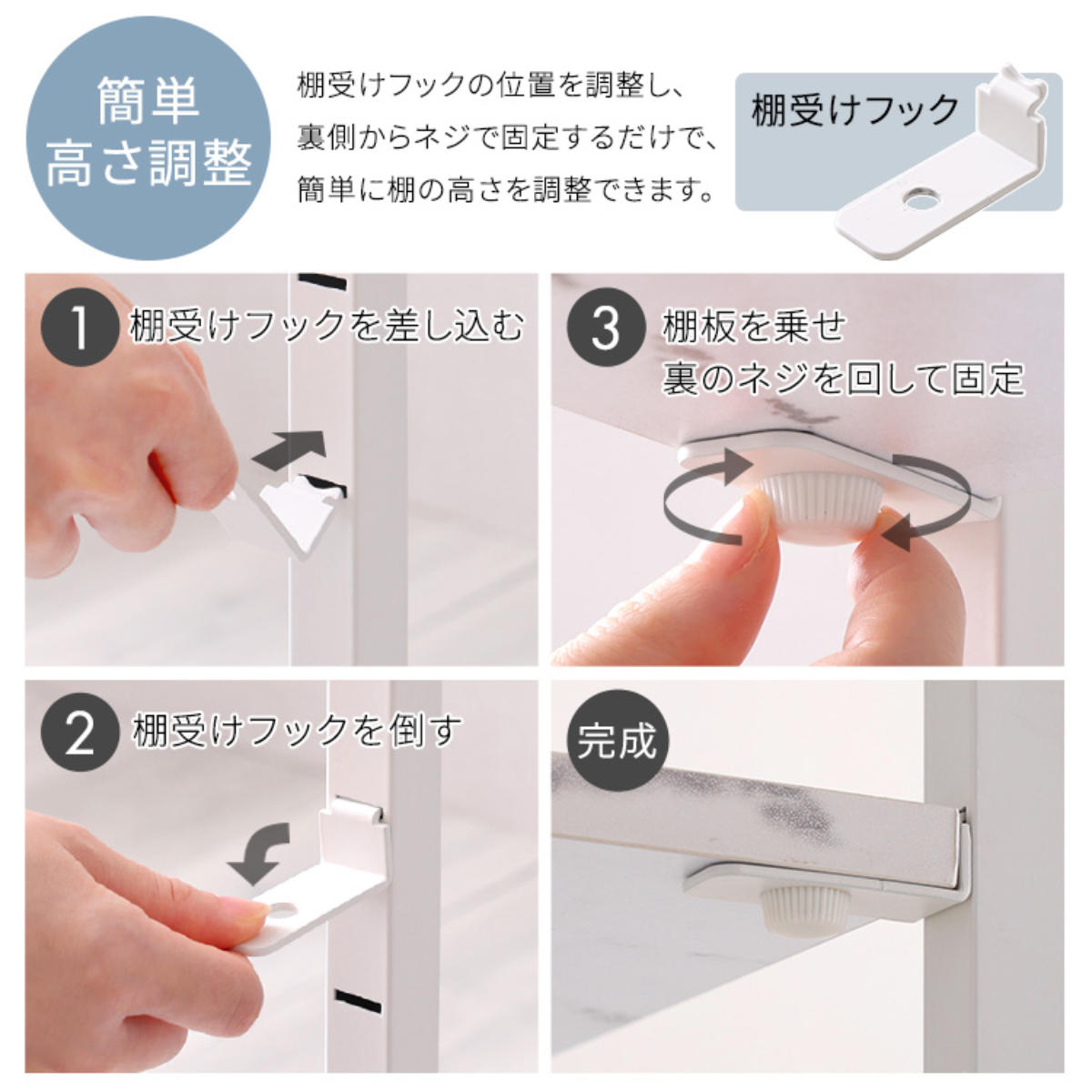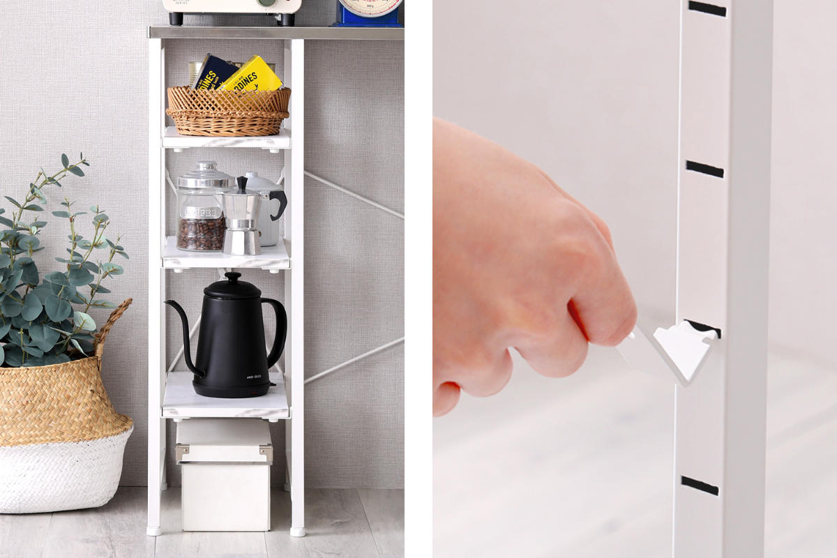 棚は5cm間隔で14段階に調整でき、収納する物に合わせて高さを変えられます。