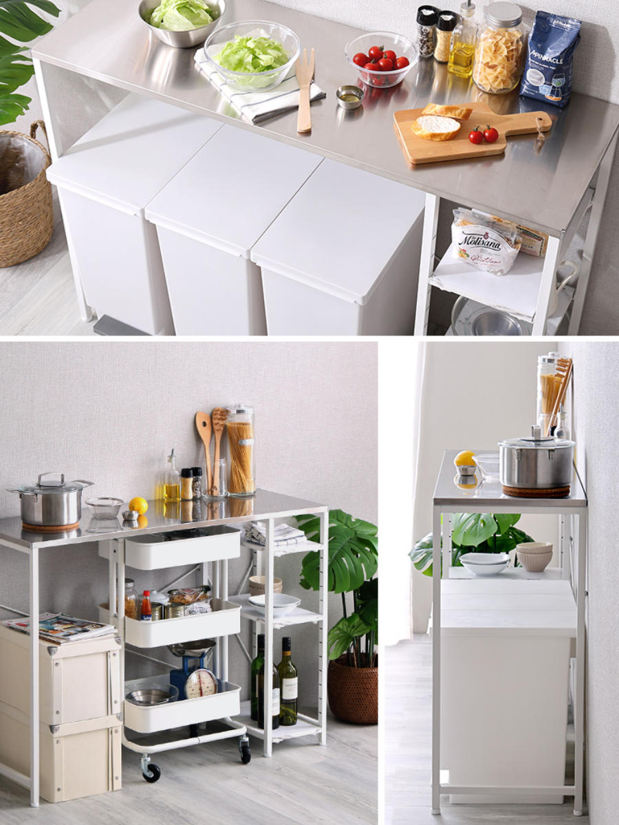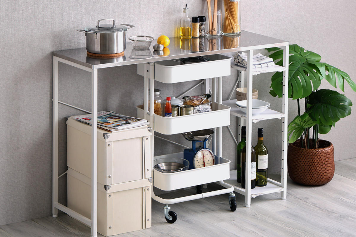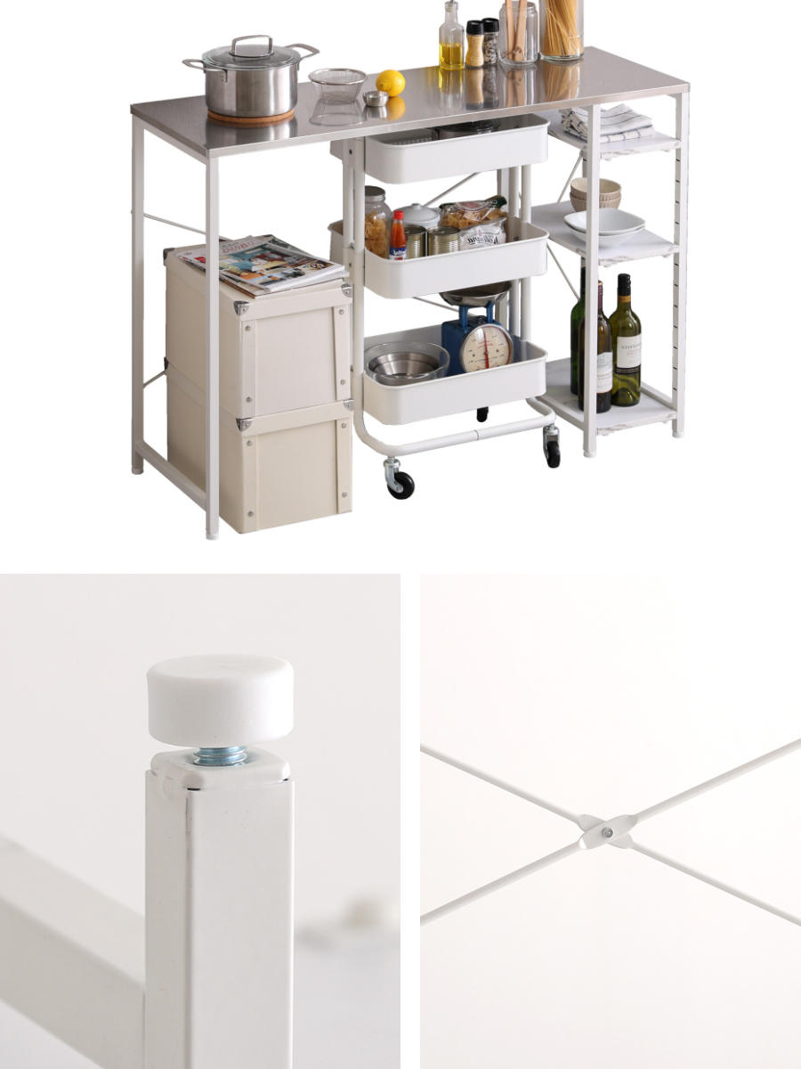 天板下にはキッチンワゴンも収納できます。使う時はサッと引き出せて、使わない時はすっきり収納可能です。※ワゴンサイズにより収納できない場合があります。
