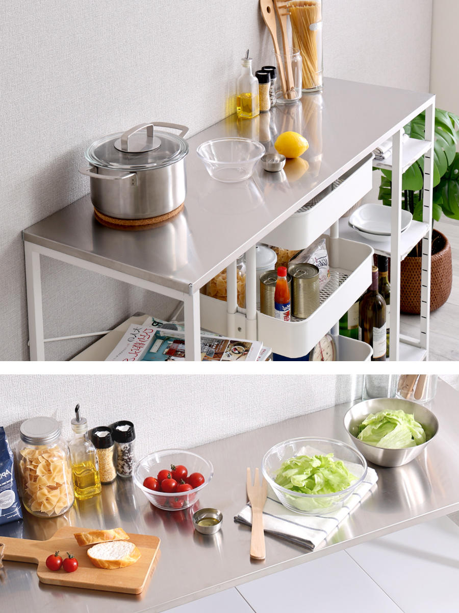 | 材質 | 天板表面:ステンレススチール 天板裏面:合成樹脂化粧パーティクルボード 棚板:合成樹脂化粧パーティクルボード フレーム:スチール 【表面加工】フレーム:エポキシ樹脂塗装 |