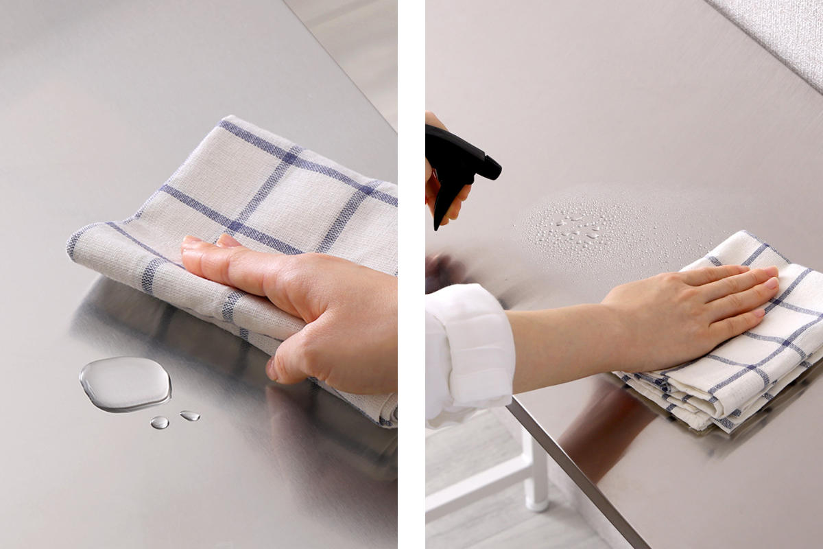 ステンレス天板は耐水性・耐久性に優れており、汚れも簡単に落とせます。天然木やプリント合板とは違い、アルコールの影響を受けないので、アルコール消毒も安心して行えます。