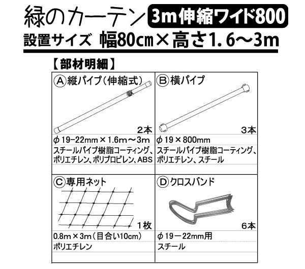 | 内容量 | 【セット内容】 縦パイプ(伸縮式)2本 横パイプ3本 園芸ネット(80cm×3m)1枚 クロスバンド6本 |